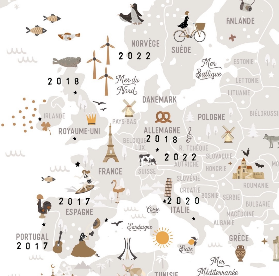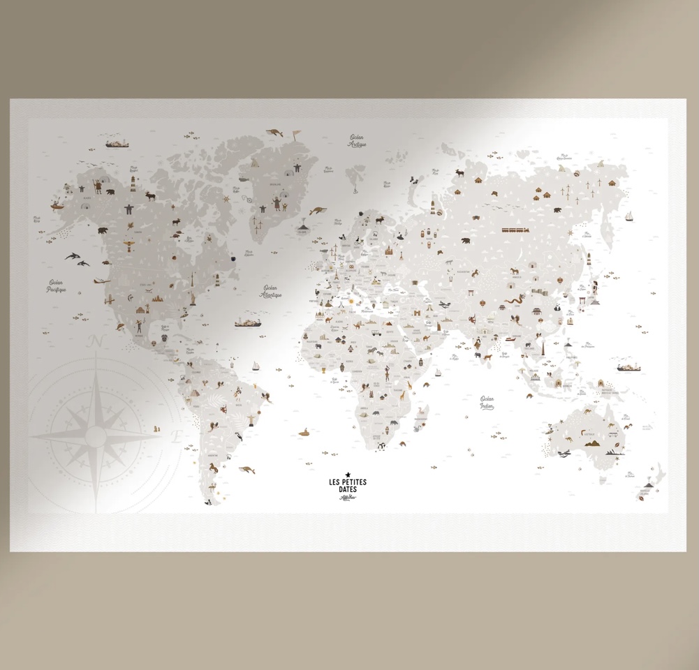 Affiche carte du monde pour tamponner toutes les dates de voyages de votre mini globe trotteur.