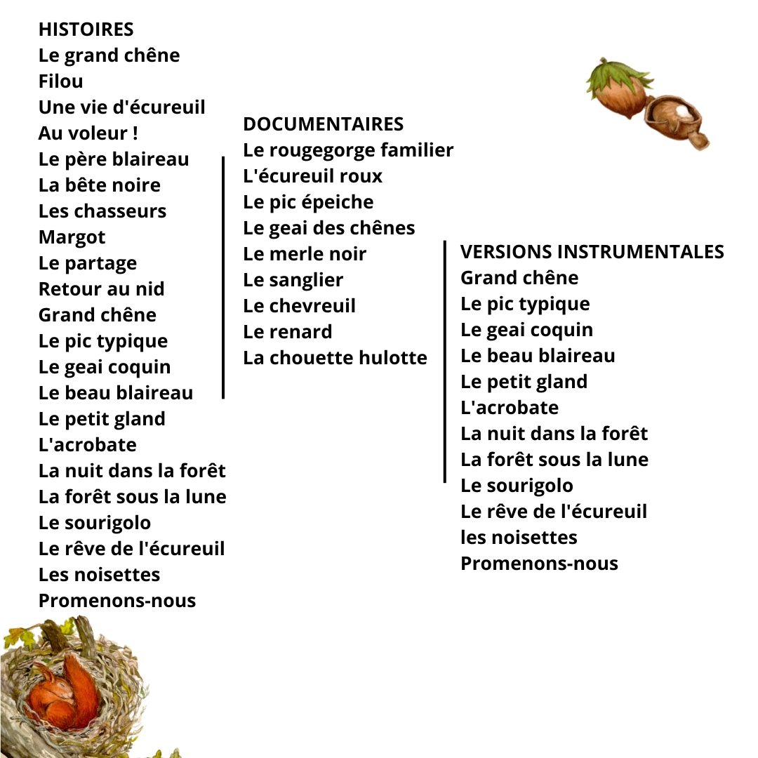 1 grande histoire, celle de Filou l’écureuil à qui l’on a volé ses glands, suivie de 9 documentaires sur les animaux de la forêt, et de 12 musiques originales en version instrumentale entendues au cours de l’histoire.Â
