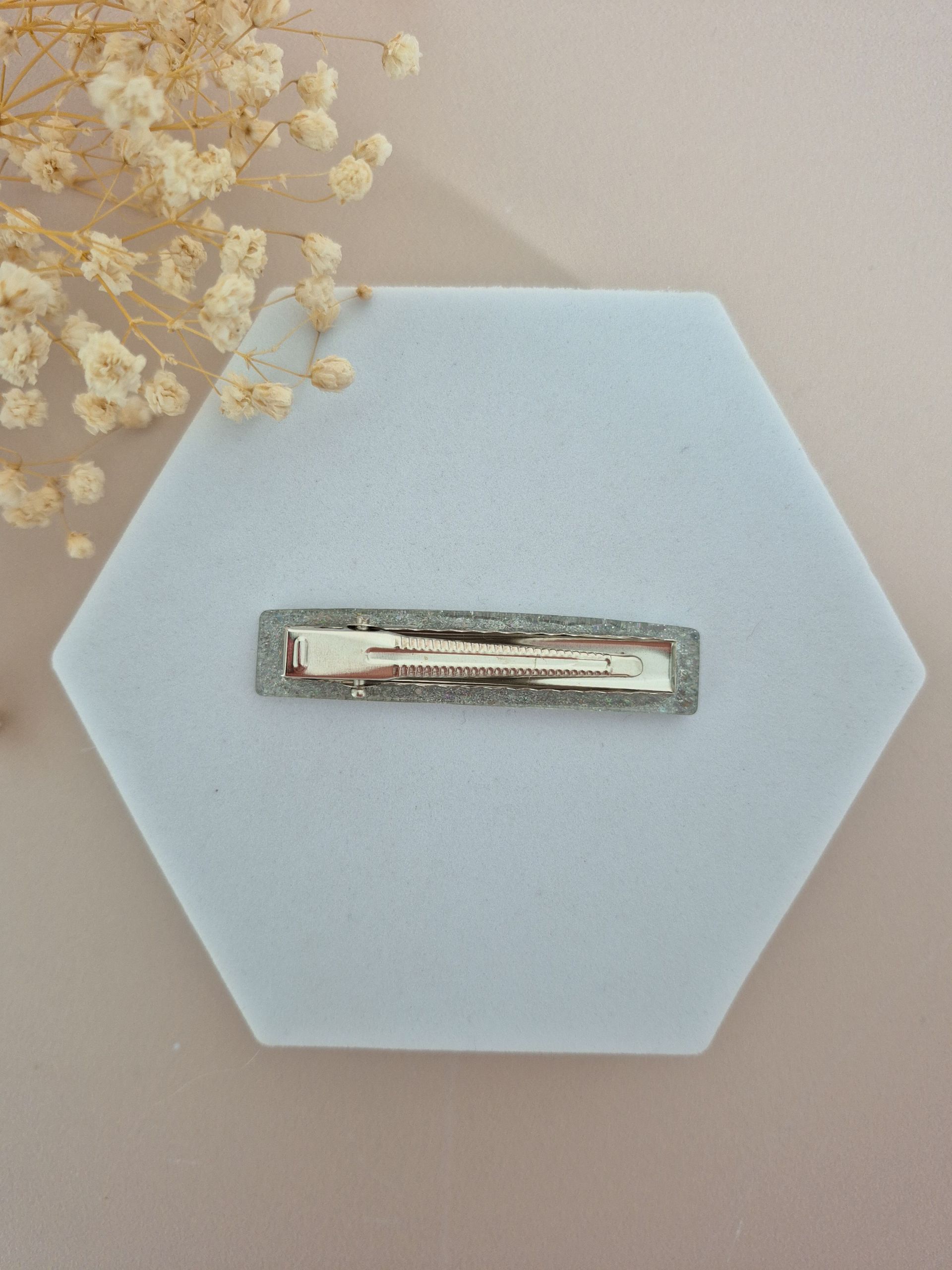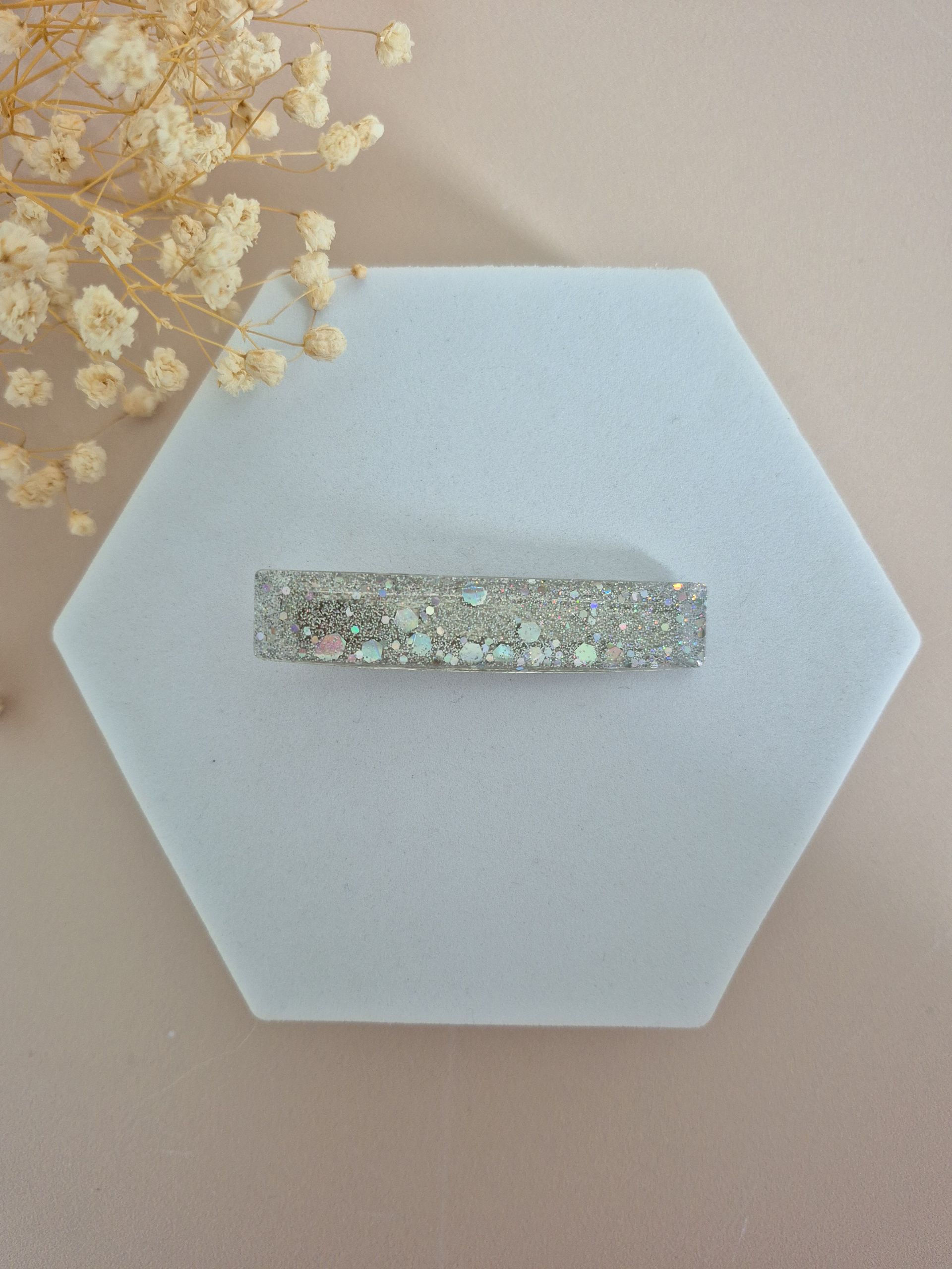Chaque barrette est faite main, en résine de marque française, avec inclusion de paillettes.