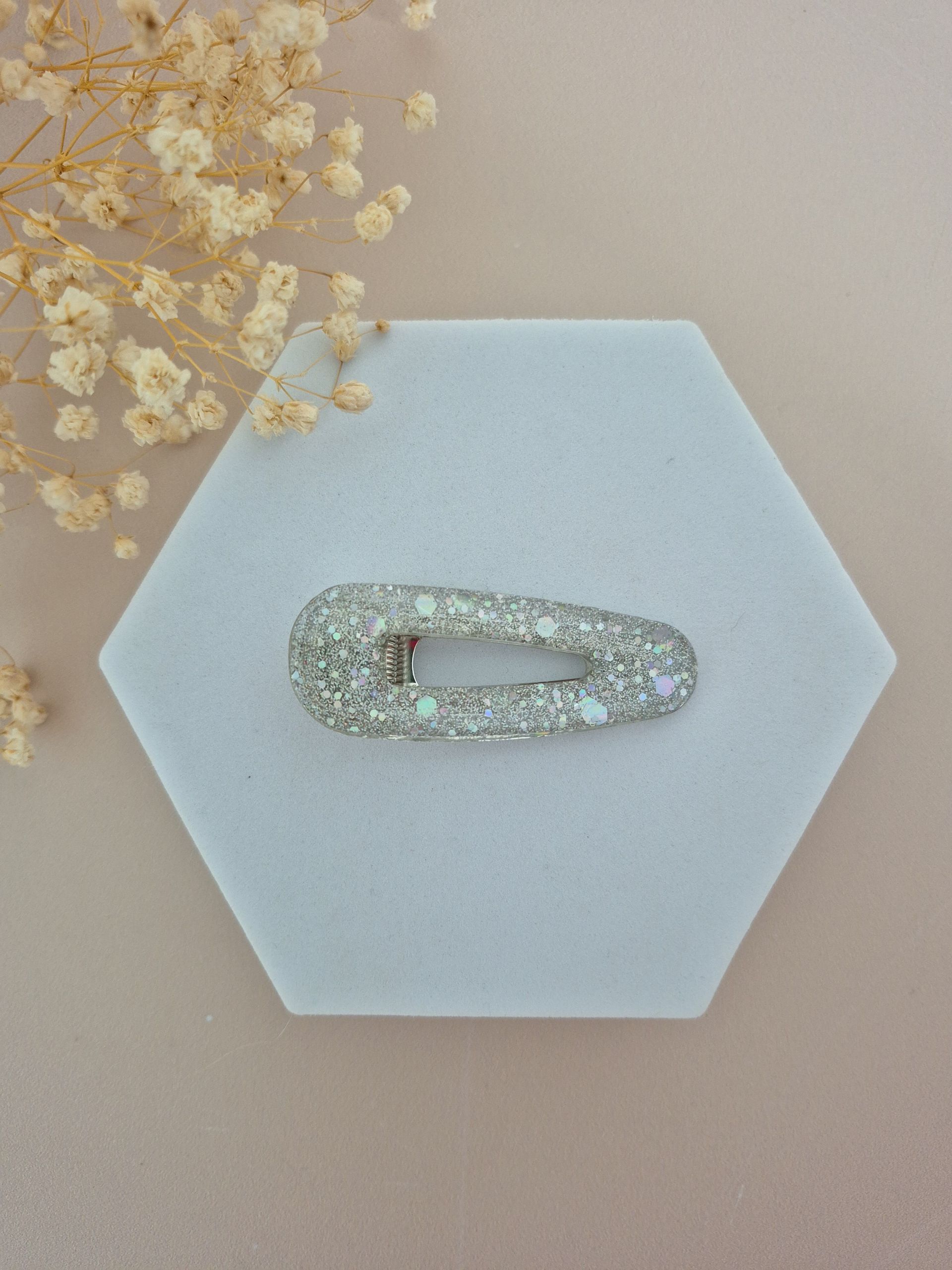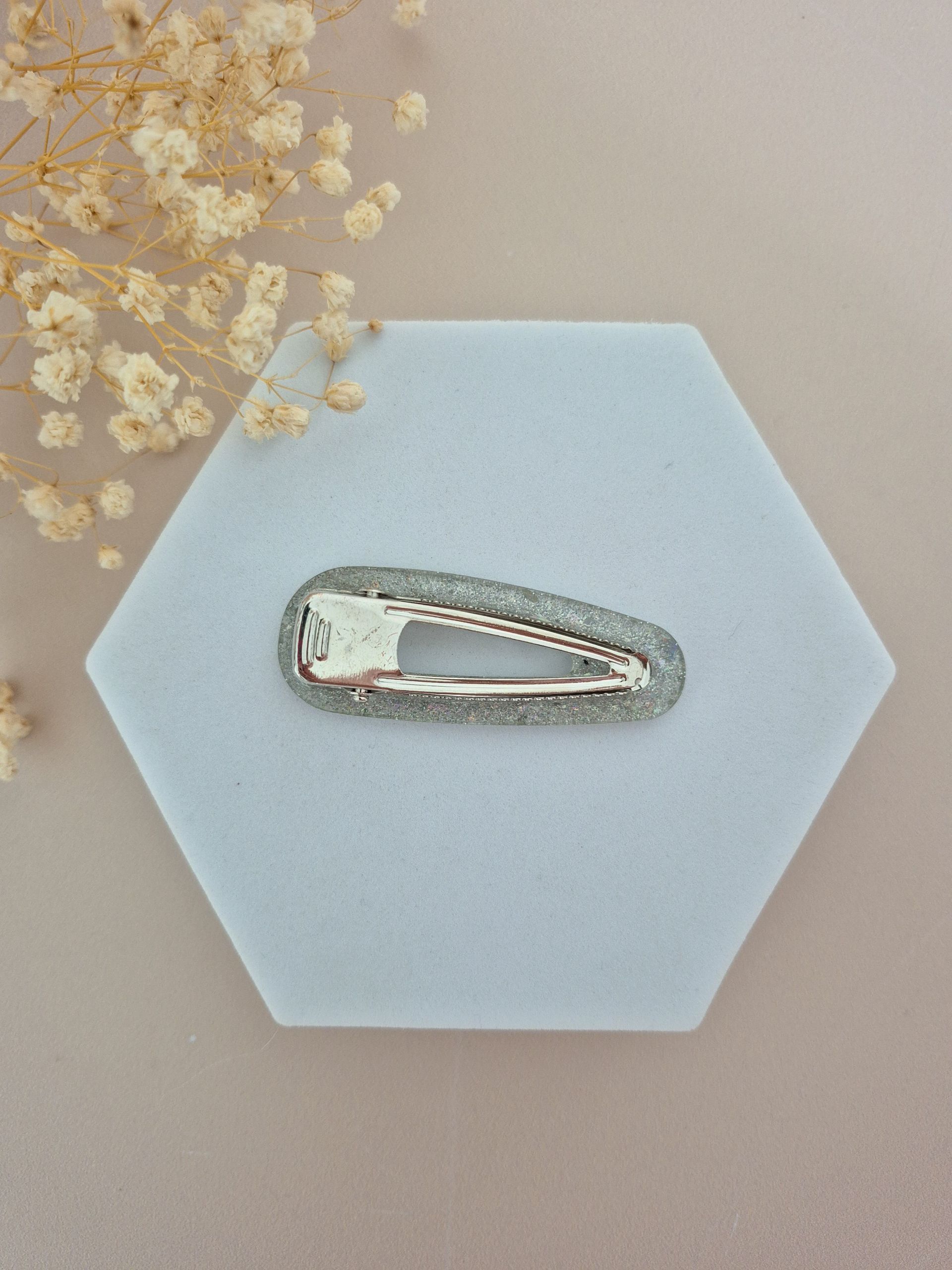 Chaque barrette est faite main, en résine de marque française, avec inclusion de paillettes.