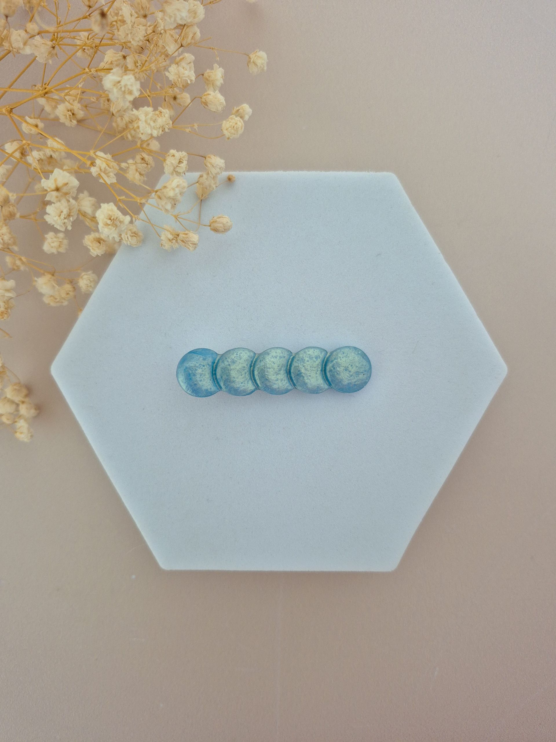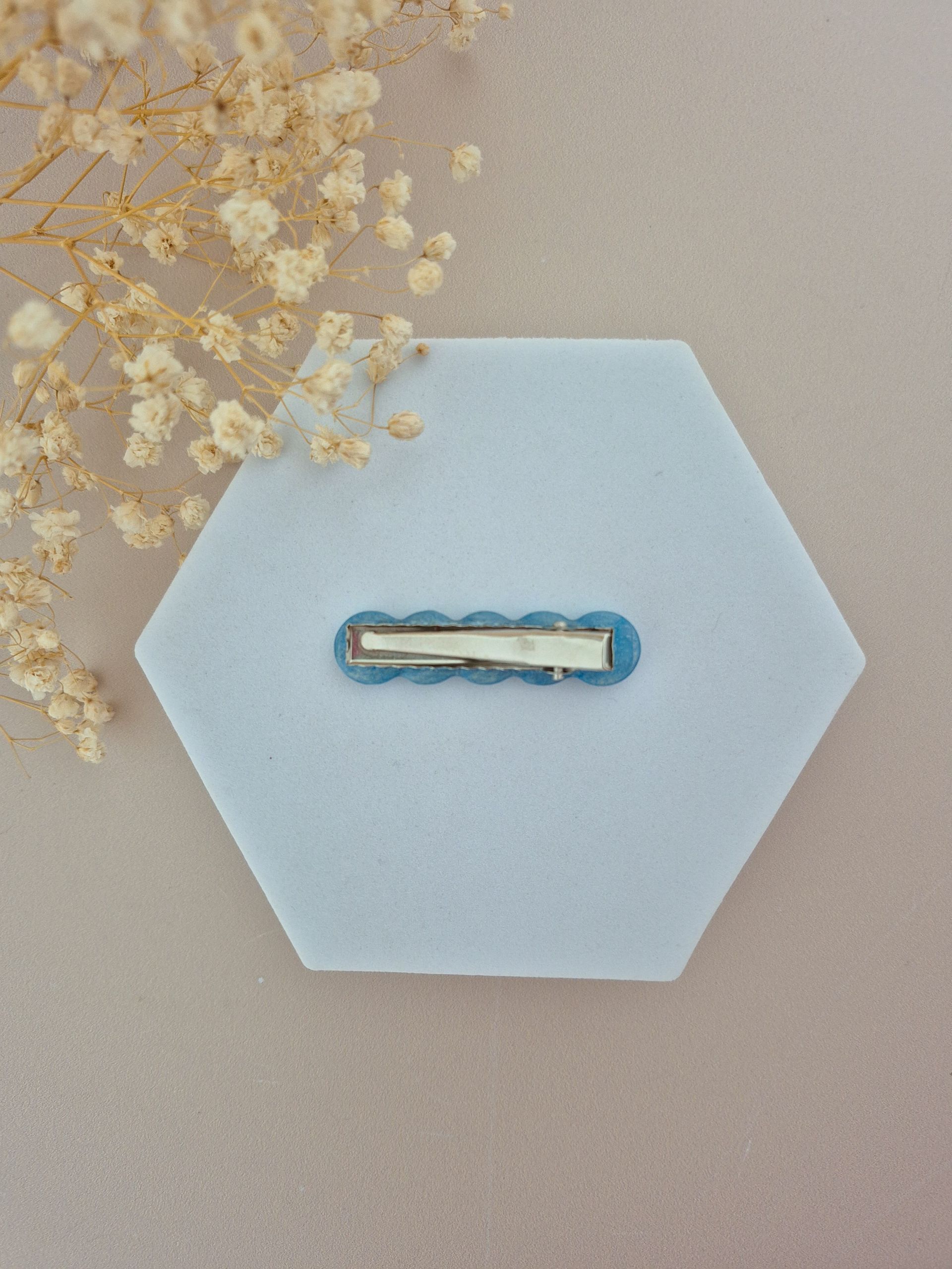 Chaque barrette est faite main, en résine de marque française, avec inclusion de paillettes.