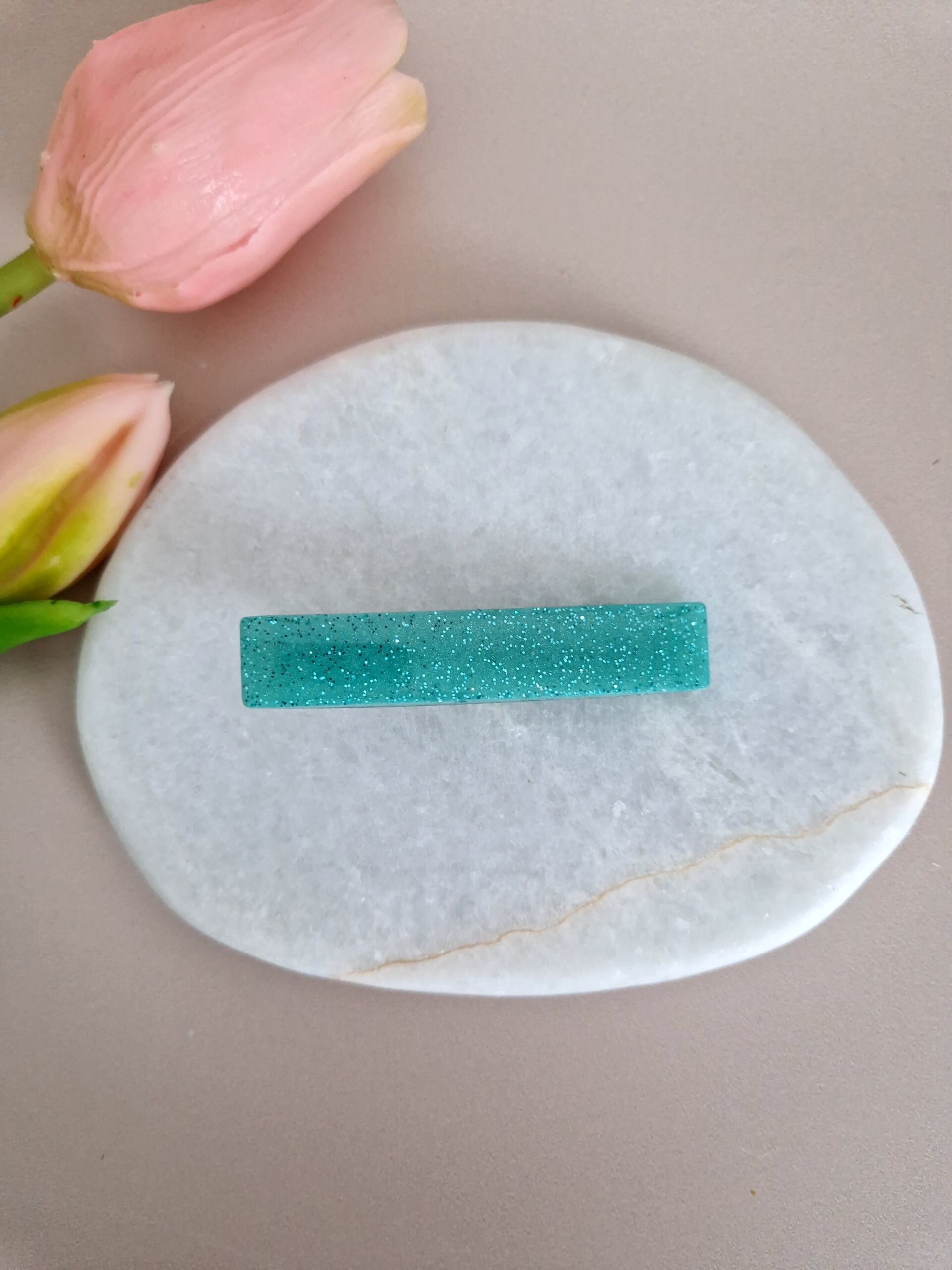 Chaque barrette est faite main, en résine de marque française, avec inclusion de paillettes.