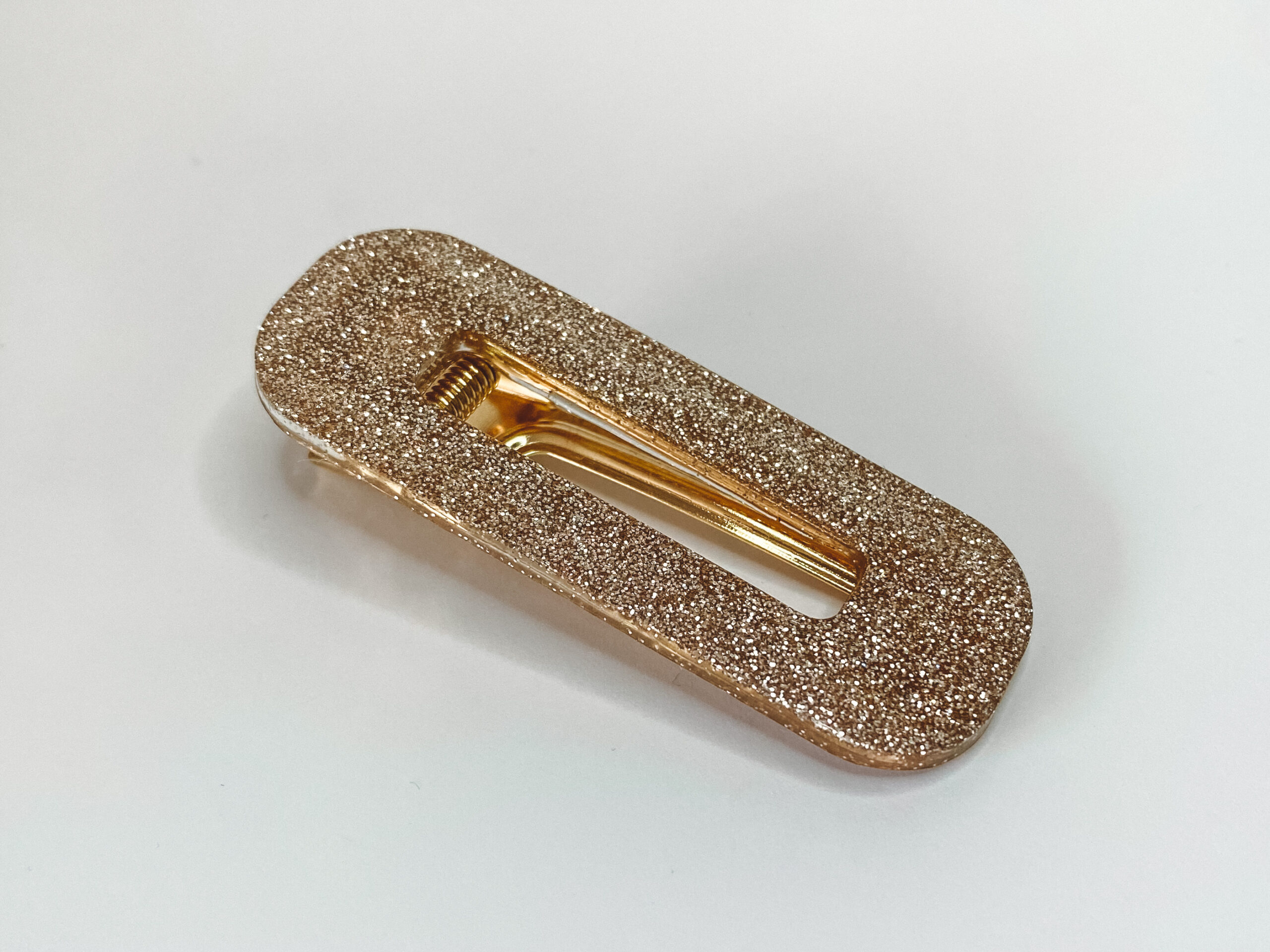 Barrette en résine traitée anti-UV. L’aspect peut varier légèrement d’un modèle à un autre en fonction du placement des paillettes. Pince de couleur doré, 5 cm.