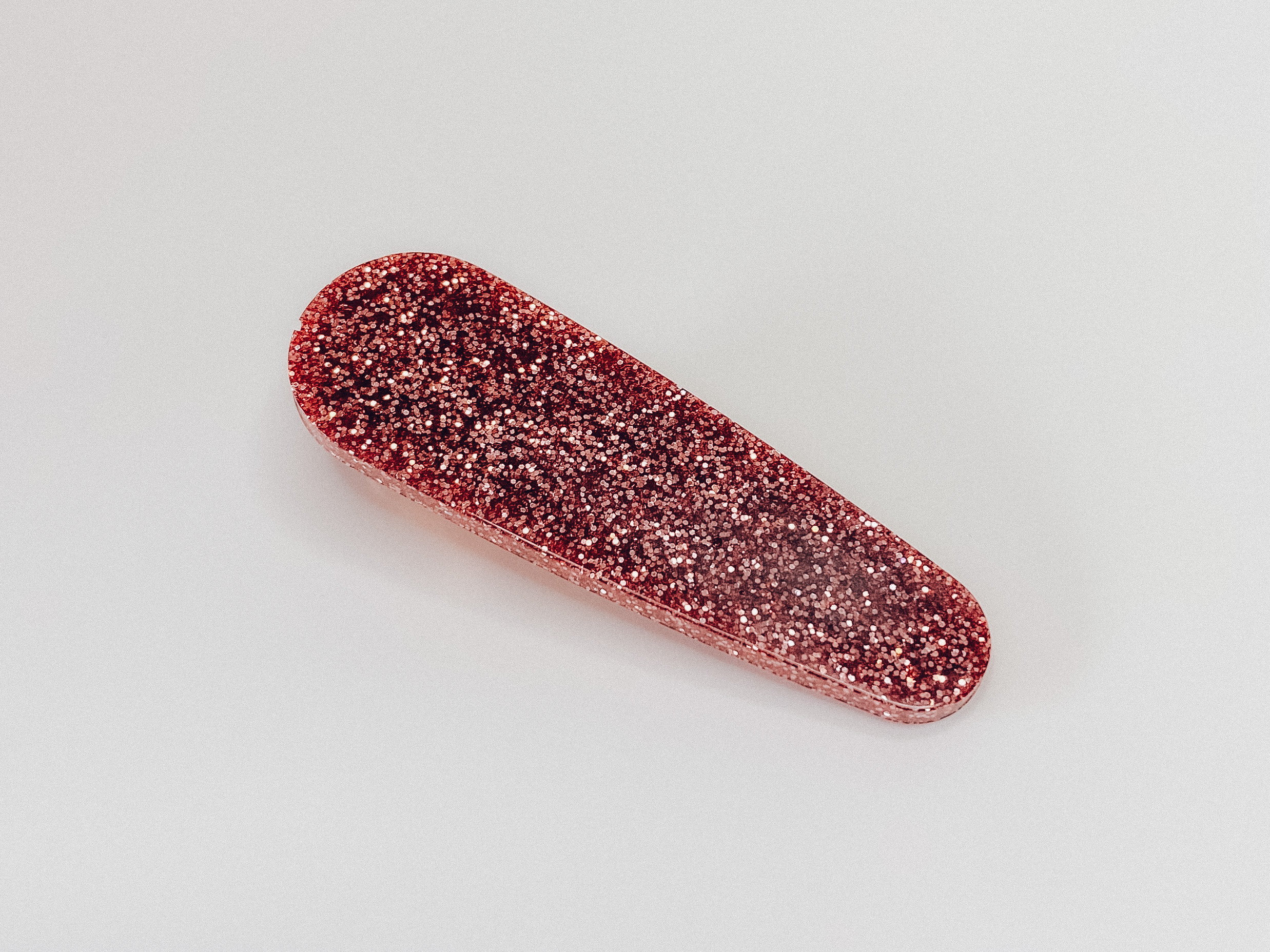 Barrette en résine traitée anti-UV. L’aspect peut varier légèrement d’un modèle à un autre en fonction du placement des paillettes. Pince de couleur doré, 5 cm.
