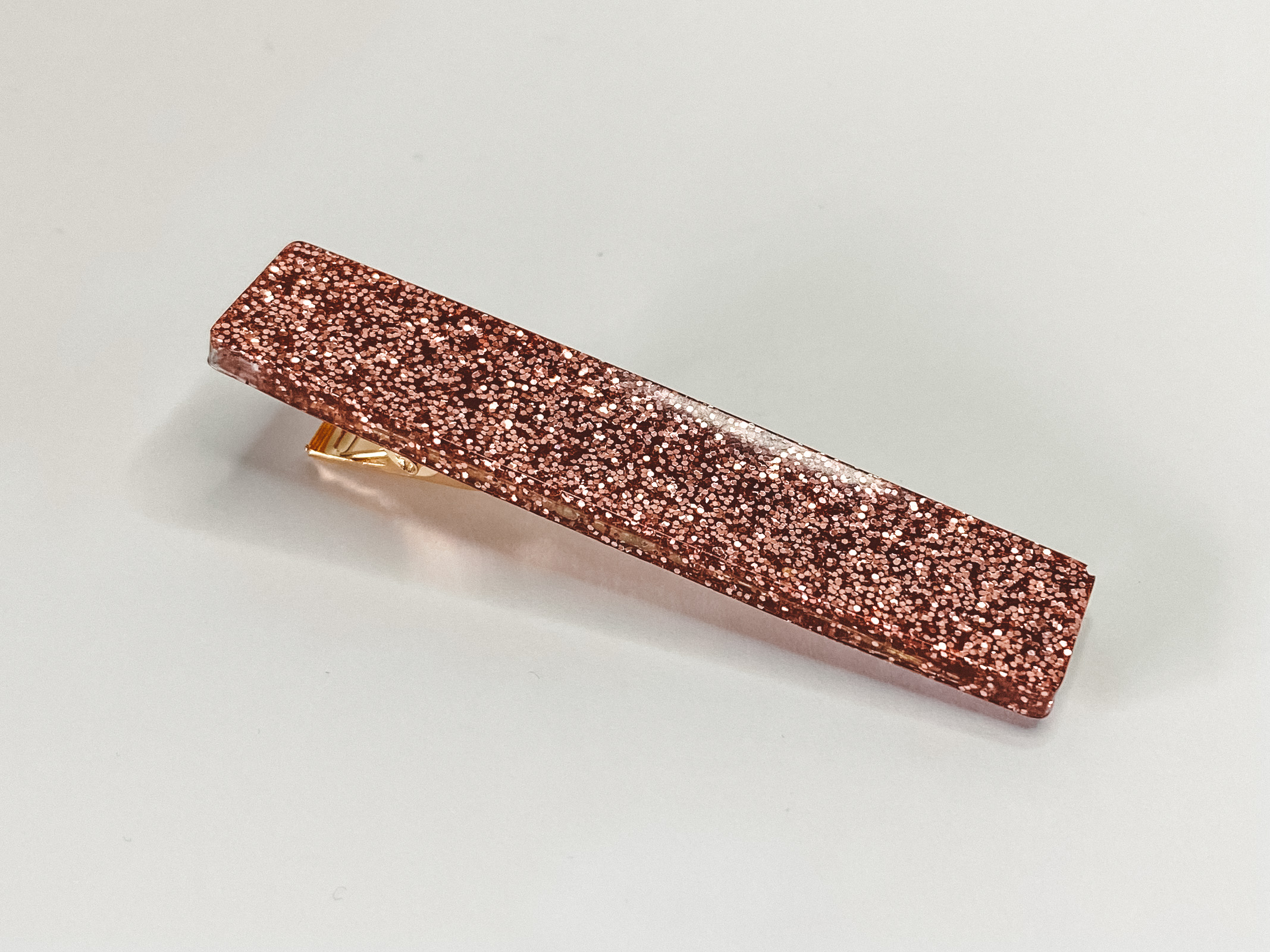 Barrette en résine traitée anti-UV. L’aspect peut varier légèrement d’un modèle à un autre en fonction du placement des paillettes. Pince de couleur doré, 5 cm.
