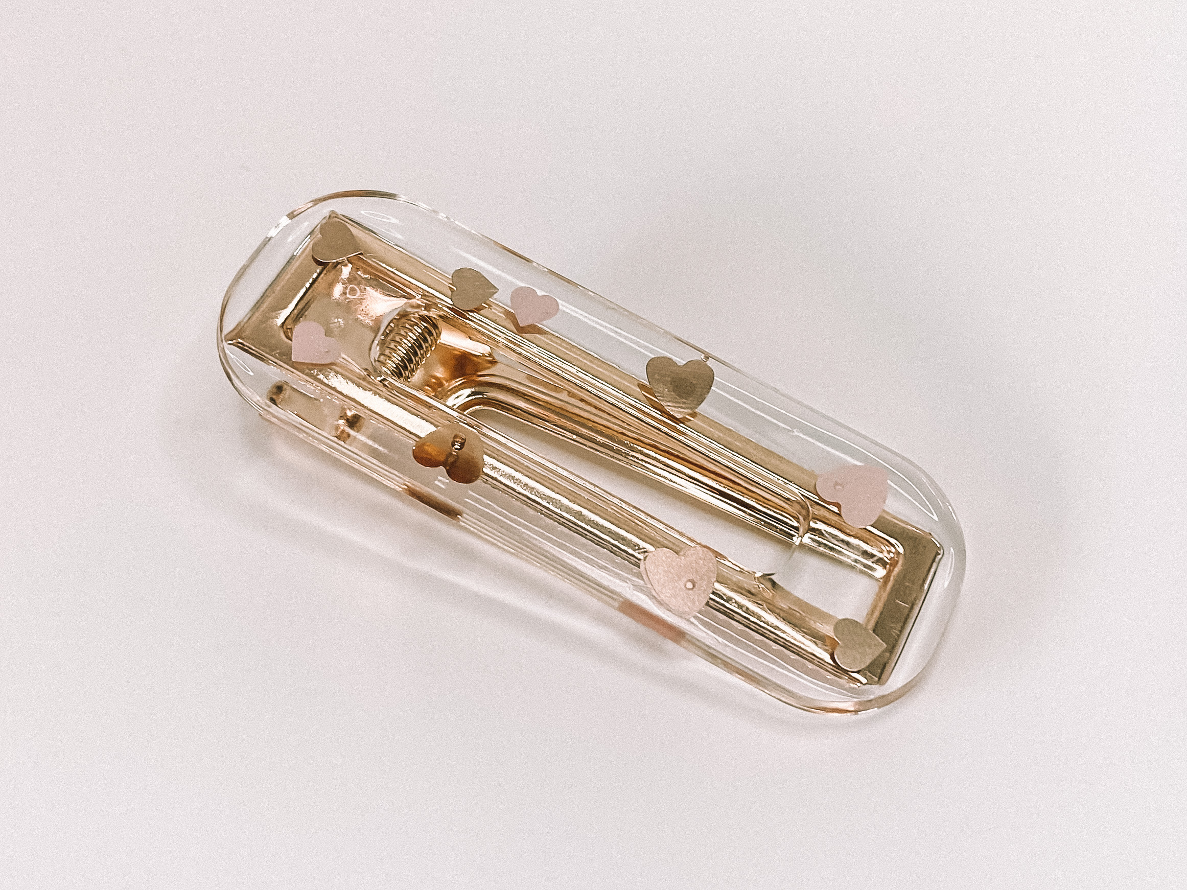 Barrette en résine traitée anti-UV. L’aspect peut varier légèrement d’un modèle à un autre en fonction du placement des petits coeurs. Pince de couleur doré, 5 cm.