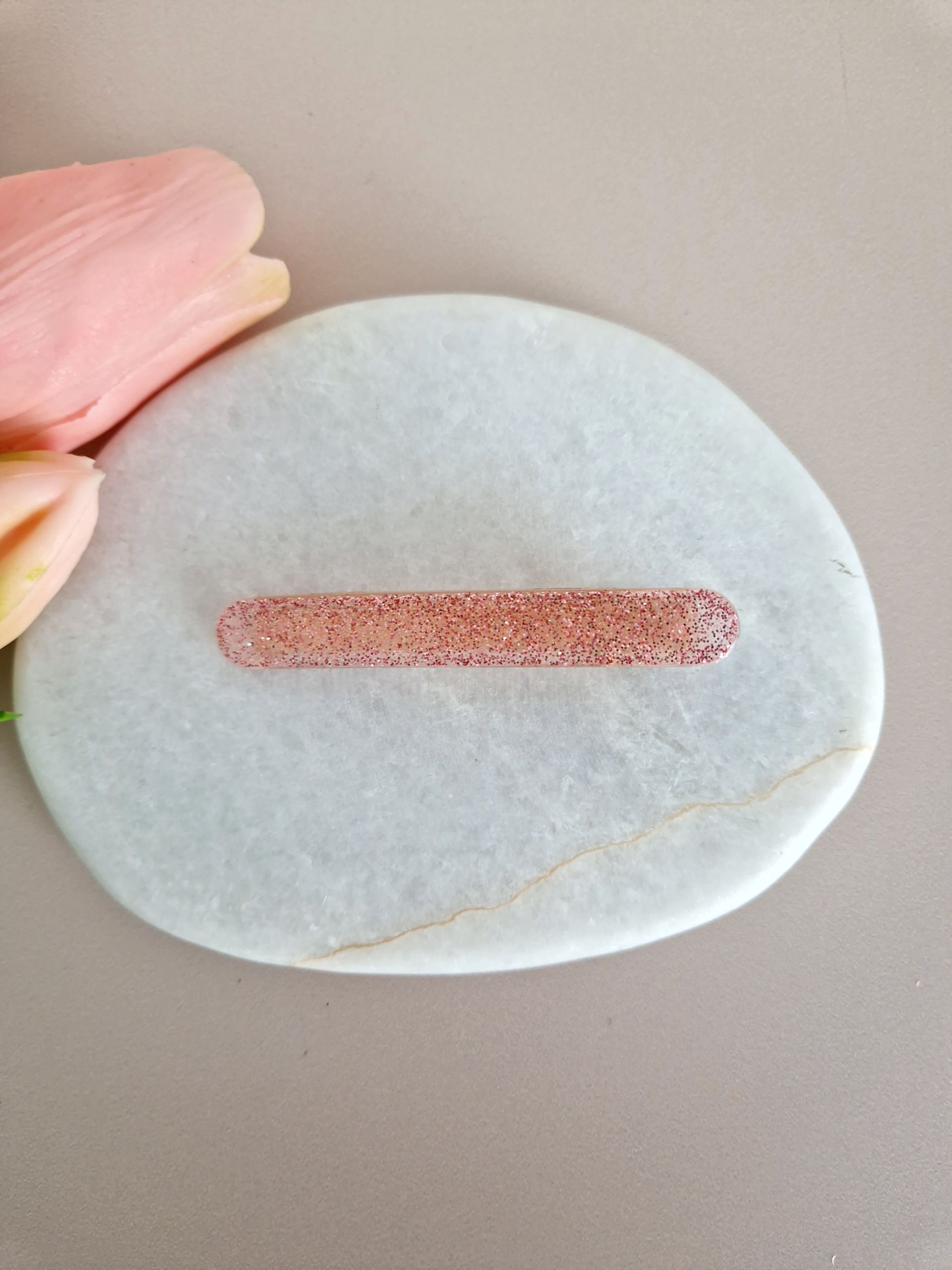 Chaque barrette est faite main, en résine de marque française, avec inclusion de paillettes.