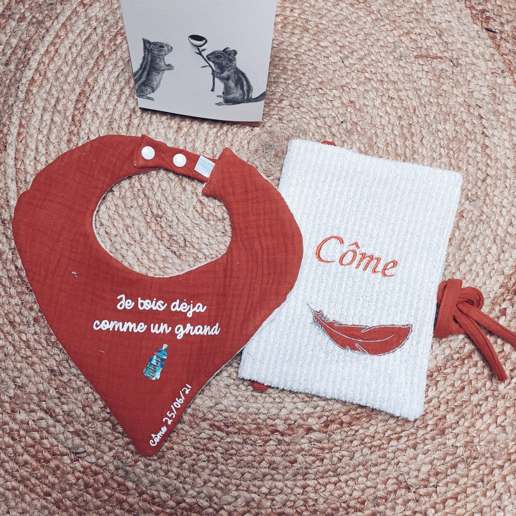 Bavoir bandana personnalisable pour Bébé « Anti Bavouille » dès la naissance pour la maison, chez nounou ou la Crèche De jolis bavoirs serviettes en coton qui peuvent être assortis avec les chaussons pour un cadeau unique ! La gamme des jolis Bavoirs bébé  accueille ce modèle en format bavoir en pointe idéal pour les bavouilles de bébé : Ces modèles sont fabriqués avec de la double Gaze 21 coloris au choix Personnalisation  : broderie machine et/ou thermocollant Fermeture du bavoir  : bouton pression qui n’arrache pas les cheveux de bébés ! Le + du produit : cadeau fait main de grande…