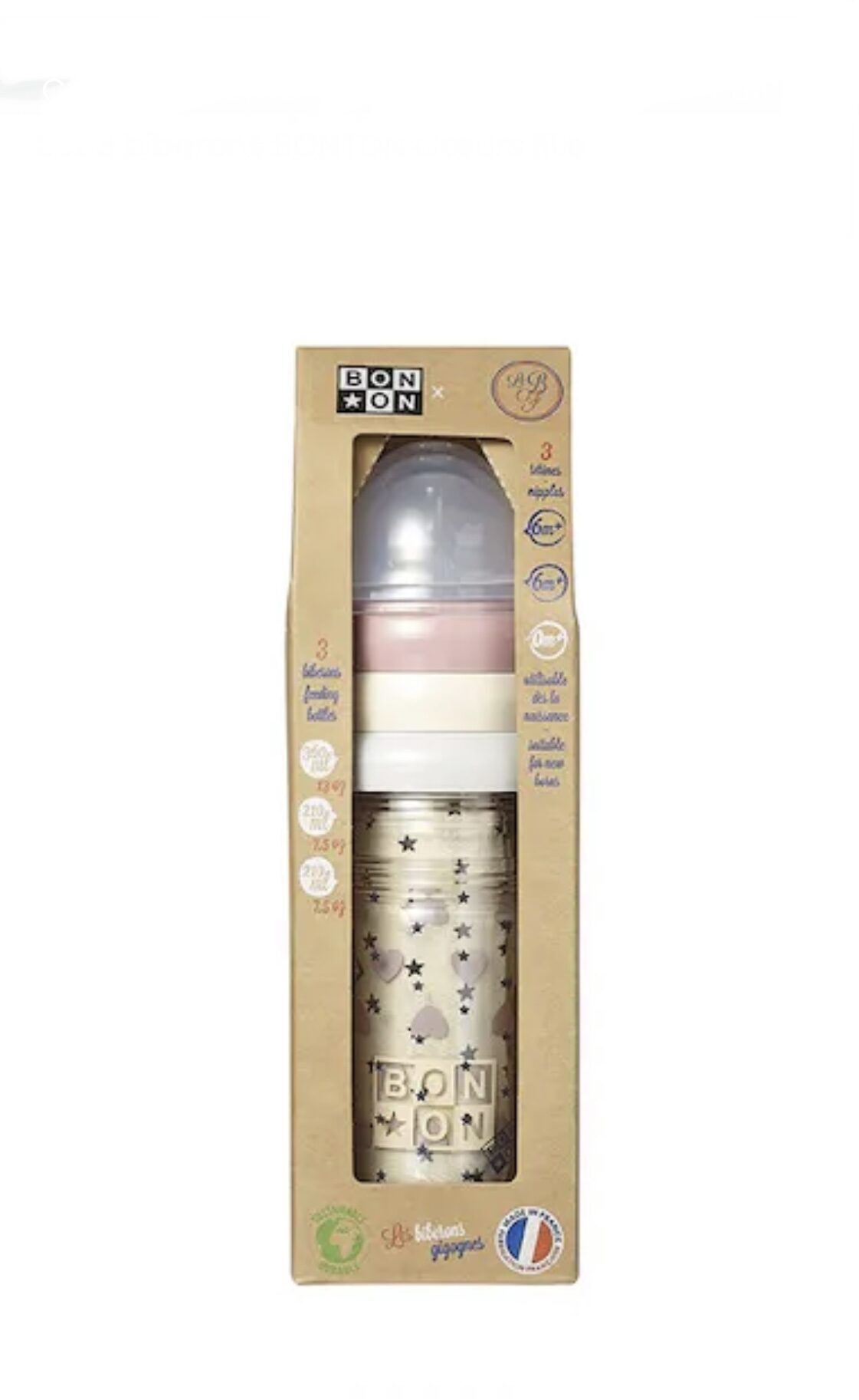 Set Bonton composé d’1 biberon 360ml avec tétine M et de deux biberons 210ml avec tétines S. Nos tétines sont toutes anti-coliques et s’adaptent sur tous nos biberons. Nos biberons ne contiennent aucun bisphénol et sont donc BP(A-Z) Free pour la santé de vos bébés.