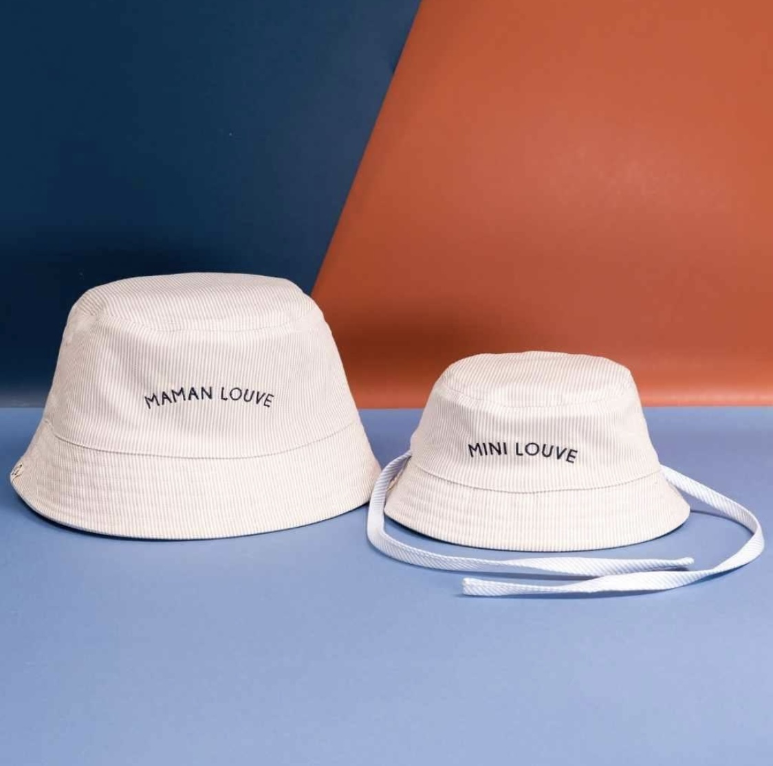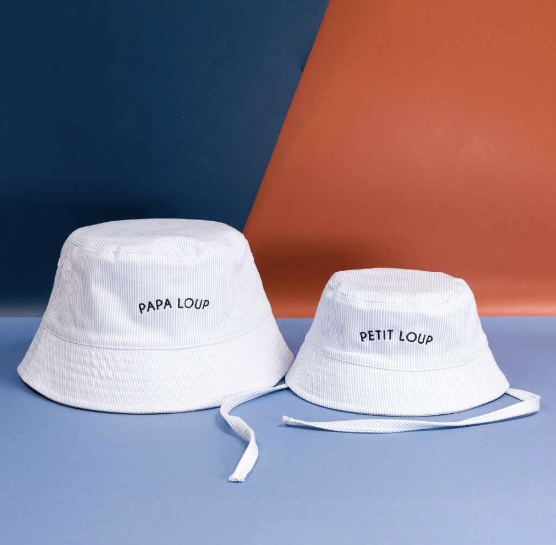 Broderie : Papa Loup au recto / Maman Louve au verso Modèle réversible : recto rayures bleu ciel / verso rayures crème