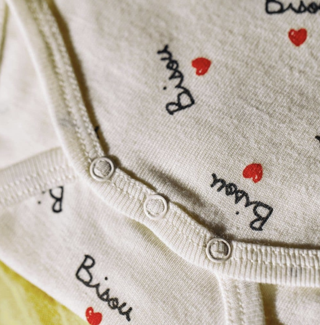 Le body Bisou habille avec malice et mignonnerie tous les babys boys and girls de 3 à 18 mois. Hyper pratique avec ses pressions au niveau de l’entrejambe et son encolure américaine qui convient à tous les kids. La collection Bisou Kids, c’est un mini vestiaire tout doux, 100% coton Bio.