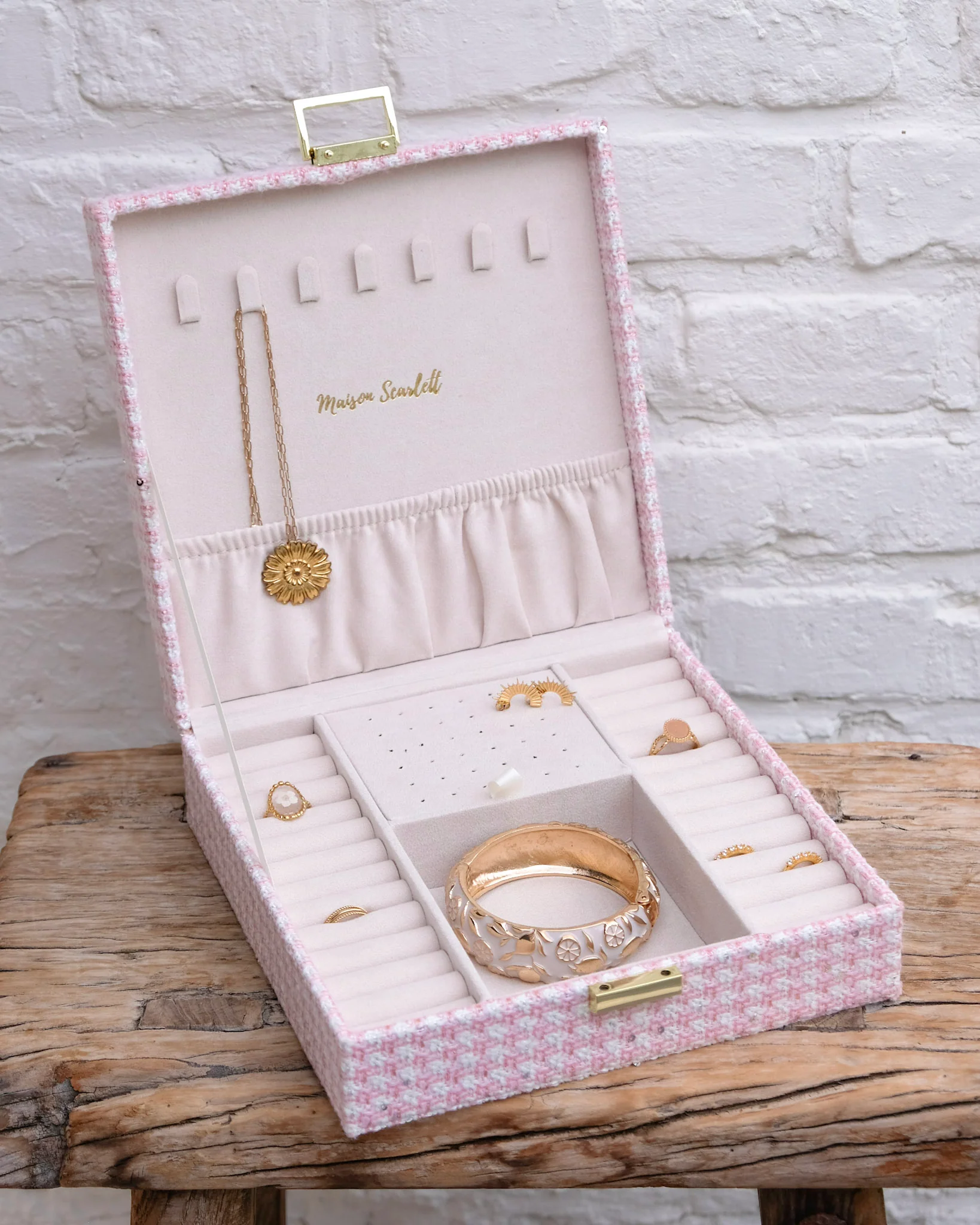 Boîte à bijoux Anne en pied-de-poule rose.