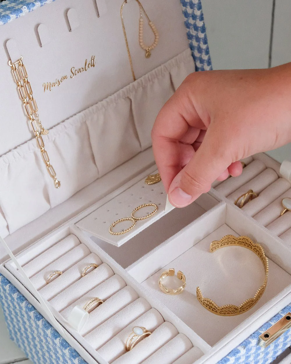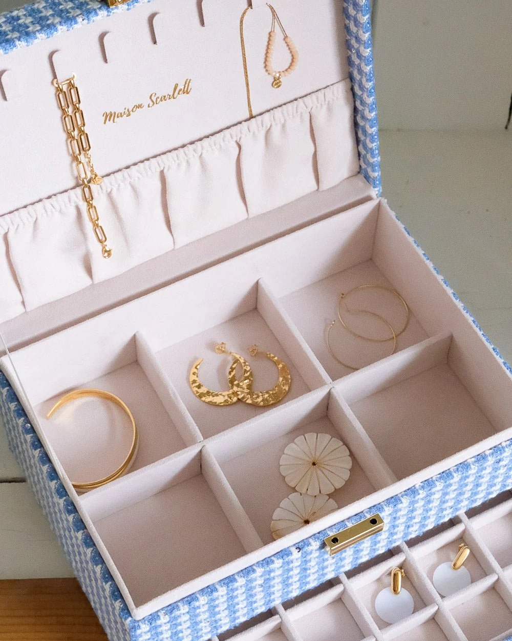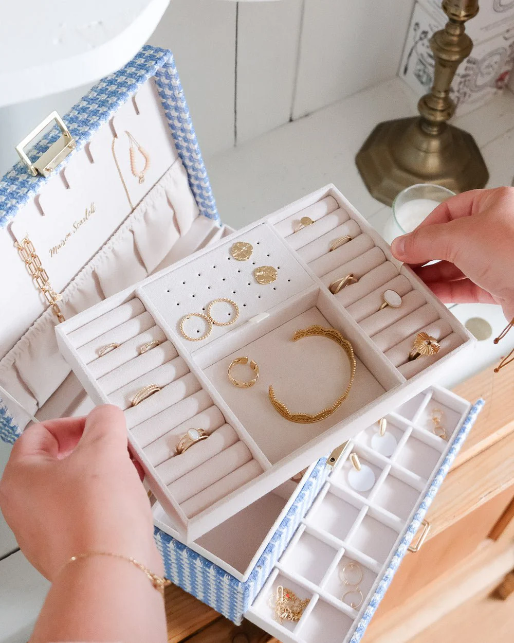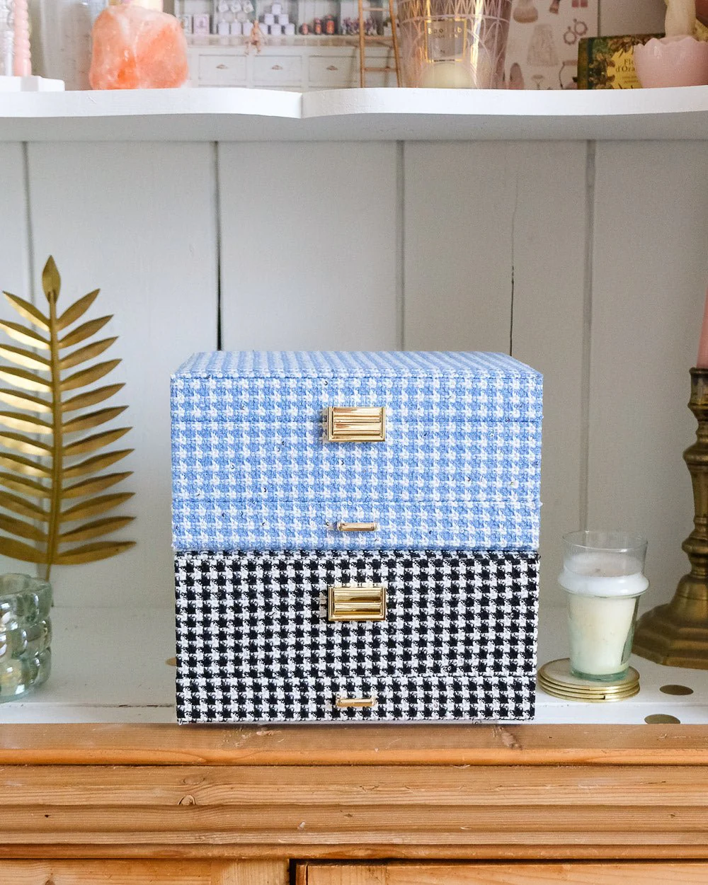 Boîte à bijoux Anne en pied-de-poule bleu.