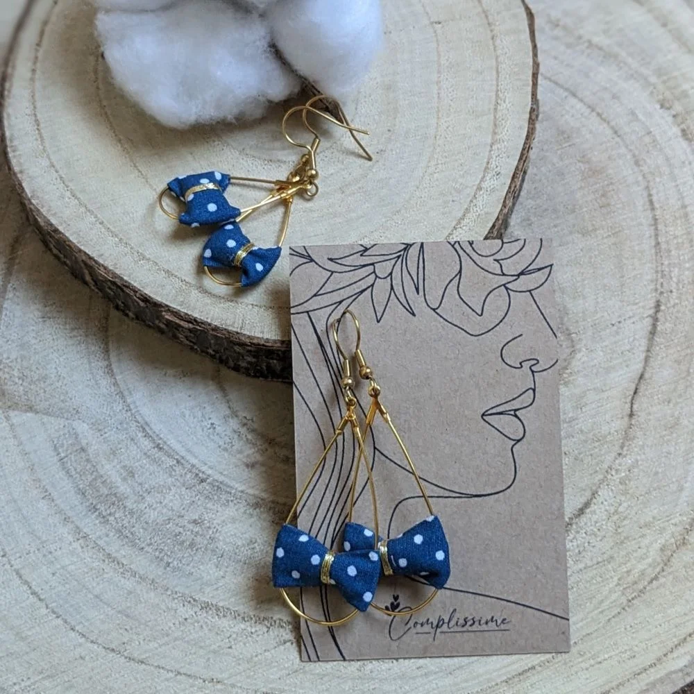 Ces jolies boucles d’oreilles en tissu petit pois (100% coton) et en forme de gouttes sont agrémentées d’un fil doré. Disponibles en deux tailles, version adulte et enfant. Voici l’un des premiers produits upcyclés provenant des chutes de coton de l’atelier ! Nous valorisons chaque bout de tissu et lui donnons vie dans des créations uniques et sur-mesure !