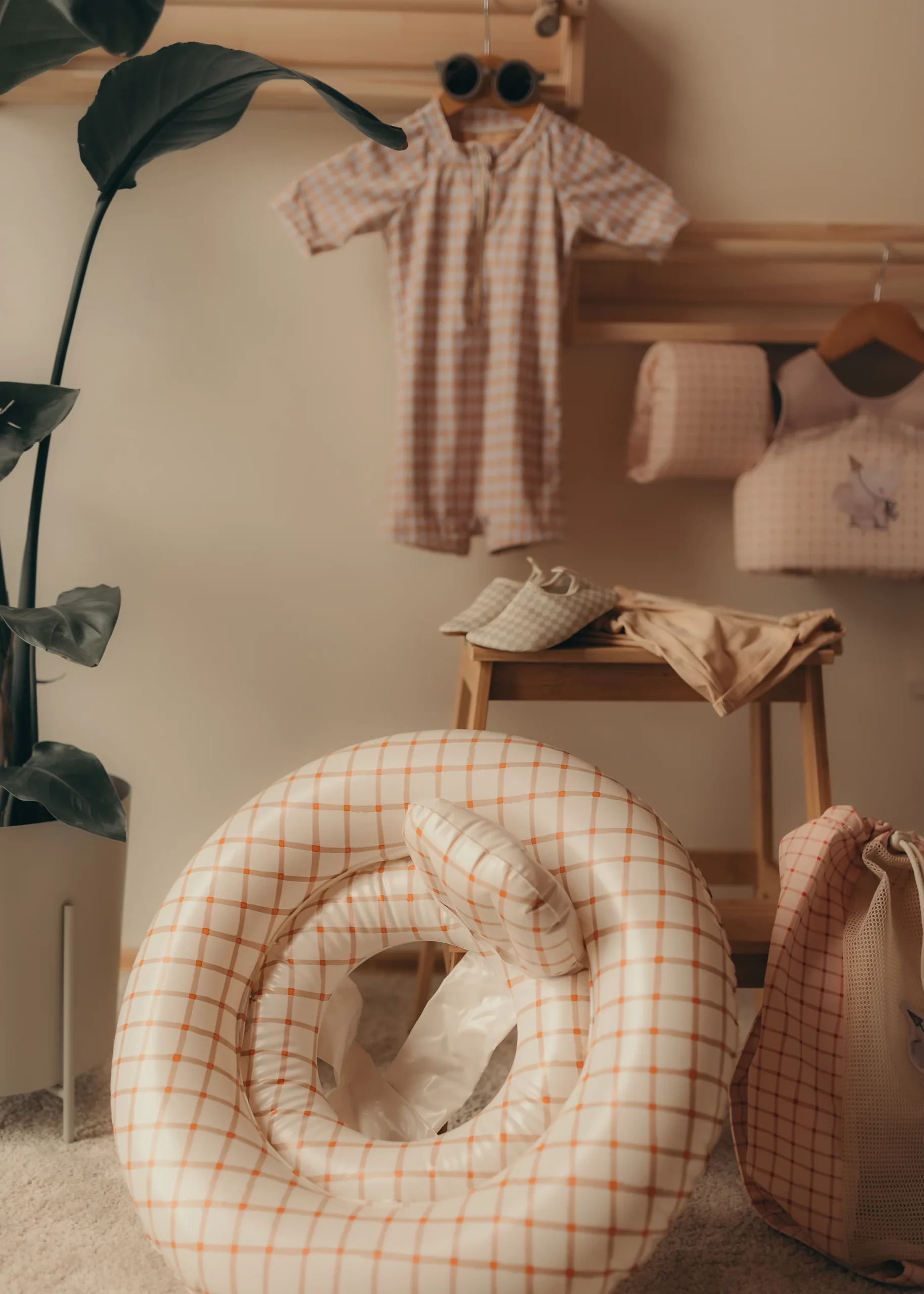 Bouée gonflable pour bébé – Modèle Organic Squares à taille unique. Elle dispose d’une assise et d’un dossier de soutien. Âge : 1 à 2 ans