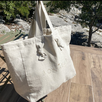 Vous allez craquer sur notre nouvelle collection de cabas en lin hyper canon pour un look élégant et décontracté. Il vous accompagnera partout, au bureau, en cours, pour vos virées shopping, en vacances ,…. C’est le sac idéal à s’offrir absolument. Coloris sable avec sa jolie broderie BONHEUR couleur or-champagne et entièrement doublé. Vous pourrez glisser vos clefs, porte monnaies, dans la petite poche à l’intérieur.