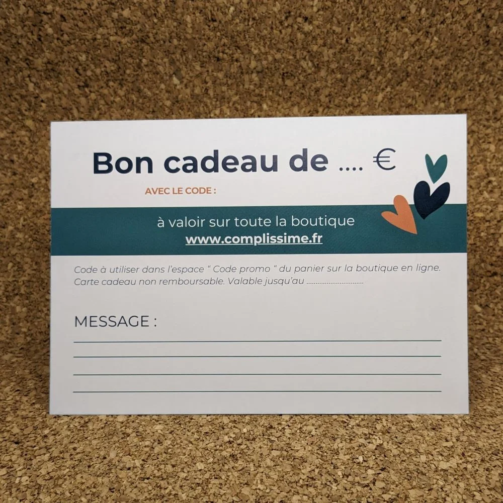 Offrez la carte cadeau à la personne de votre choix afin qu’elle puisse commander ce qu’elle souhaite sur la boutique en ligne Complissime (hors rubrique collaboration). Vous pouvez ajouter un message personnalisé sur la carte, n’hésitez pas à l’écrire dans la partie « Notes de commande » qui se situe dans les « Informations complémentaires » sur la page paiement.