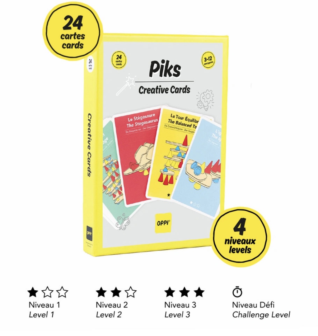 24 cartes – 4 niveaux de jeu : 6 cartes niveau “Facile” 6 cartes niveau “Moyen” 6 cartes niveau “Difficile” 6 cartes niveau “Challenge” Vous manquez d’idées pour réaliser une création ? Vous voulez vous lancer des challenges et devenir expert Piks ? Les cartes créatives sont parfaites pour ça ! Tout est possible avec Piks : construire une tour géante mais pas que ! Vous pouvez créer tous les animaux et personnages : un papillon, un rhinocéros, un bonhomme, … L’imagination est sans limites !