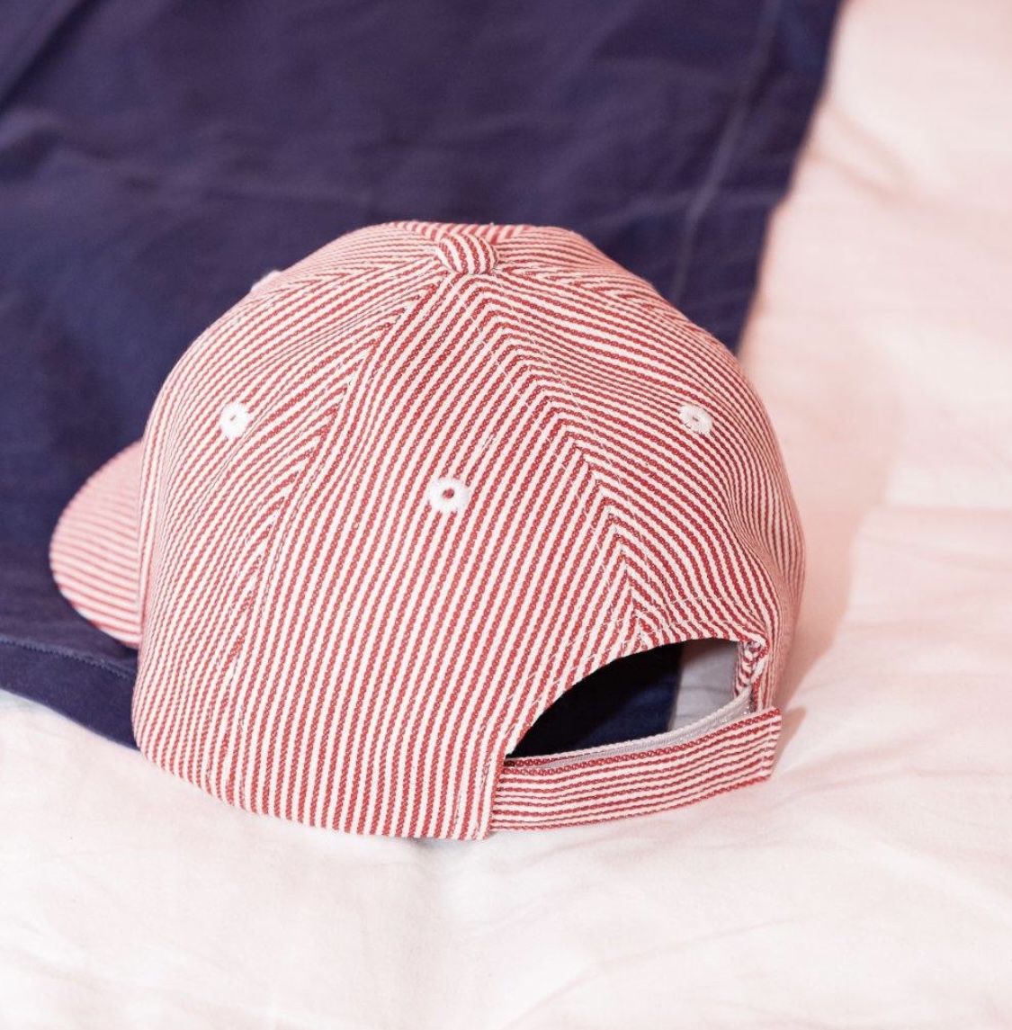 Couleurs : rayures rouges, broderie et dessous de la visière marine