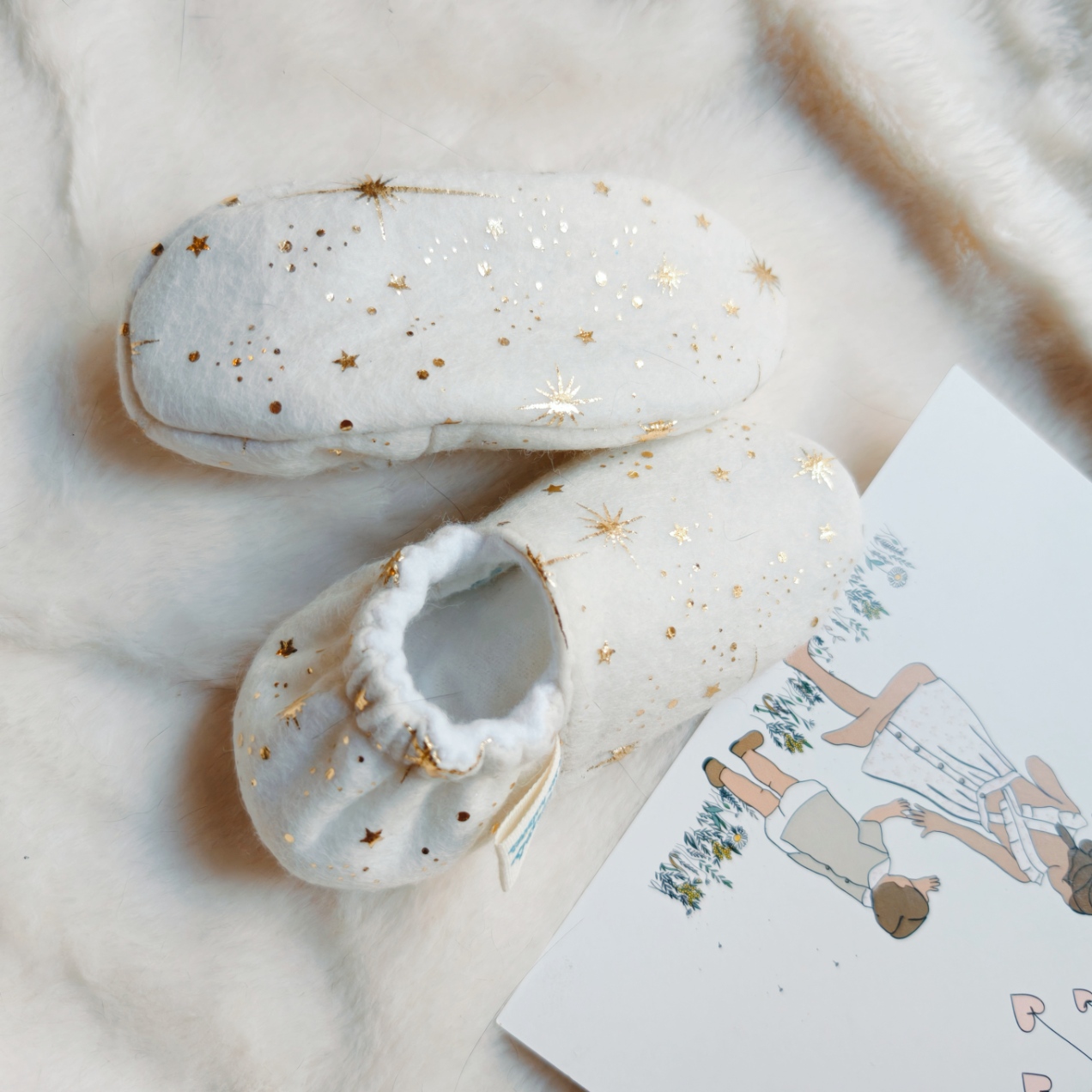 Chaussons naissance en coton blanc avec étoiles dorées : douceur et magie dès les premiers instants