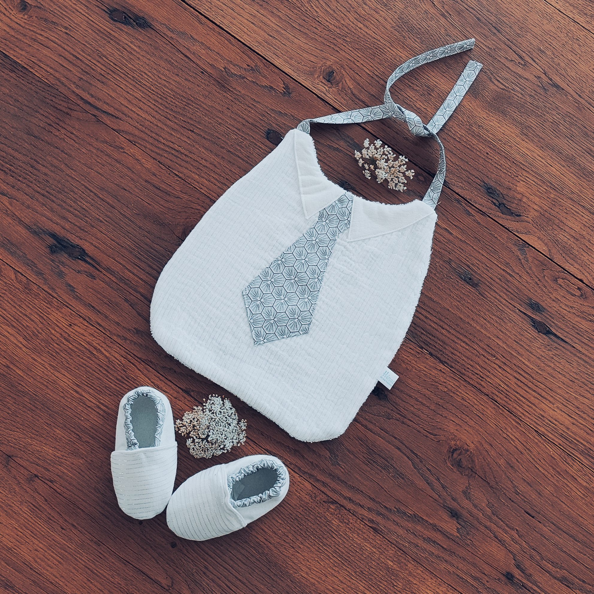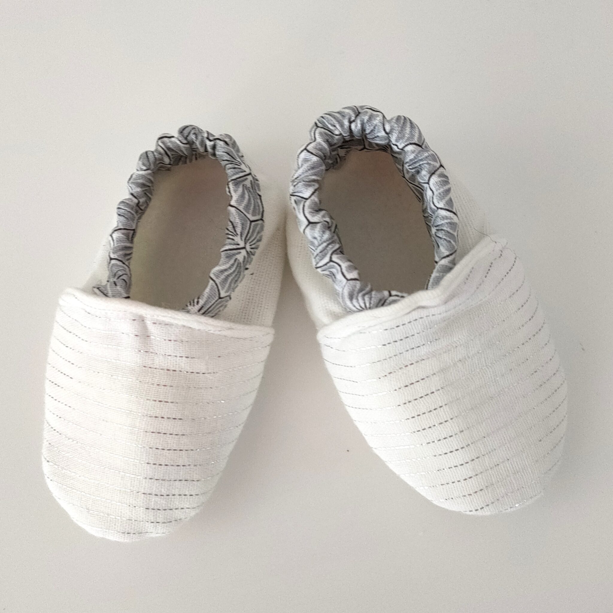 Chaussons Personnalisables Bébé en coton modèle « Monsieur » De jolis chaussons en coton avec des motifs géométriques  sur fonds de gaze de coton blanc argenté pour un cadeau unique ! La gamme des chaussons 100% coton est colorée et imagée selon les thèmes de nos inspirations : >> ce modèle Monsieur est réalisé avec une double gaze blanche de coton striée de fils d’argent. Nous proposons une personnalisation des chaussons avec un petit motif ou le prénom de l’enfant, ou encore un petit mot…vous choisissez pour une touche décorative et unique ! Les chaussons sont assortis également aux bavoirs Monsieur avec…