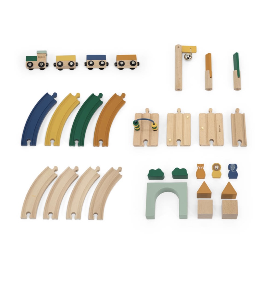 Tchou-tchou ! Montez à bord de notre train d’animaux pour quelques tours de plaisir sur la voie ferrée. La locomotive a 3 wagons magnétiques , contenant à chaque fois un pion animal différent. En connectant les différents rails, les enfants entraînent leur motricité fine et la coordination Å“il-main. Une fois le chemin de fer construit, les enfants peuvent laisser libre cours à leur imagination. La petite cloche retentit à chaque fois que le train passe. Et avec le boulier, les enfants peuvent compter le nombre de tours de rail. Les nombreux accessoires créent un monde de plaisir qui stimule la…