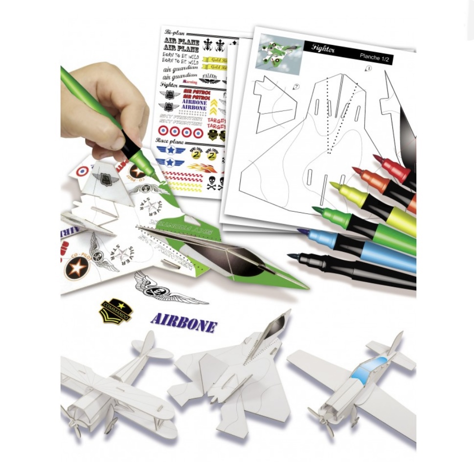 Les enfants pourront assembler et personnaliser leurs maquettes en cartons ! A tous les passionnés d’avions! Grâce à ce coffret les enfants pourront emboiter les parties en carton prédécoupées. Ensuite ils pourront les peindre et les personnaliser à l’aide des feutres et des autocollants fournis pour créer des modèles uniques ! Développe la logique et la dextérité
