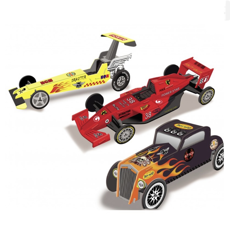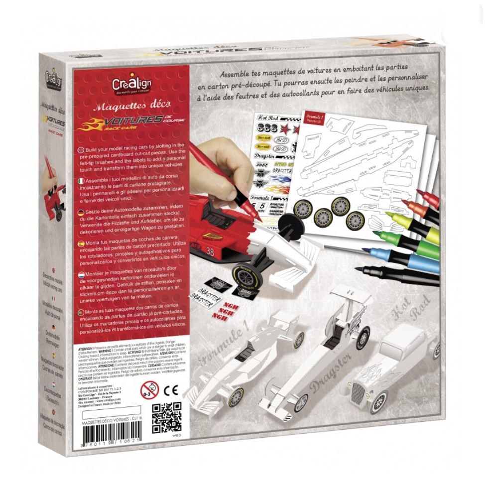 Les enfants pourront assembler et personnaliser leurs maquettes en cartons ! A tous les passionnés de voitures de course! Grâce à ce coffret les enfants pourront emboiter les parties en carton prédécoupées. Ensuite ils pourront les peindre et les personnaliser à l’aide des feutres et des autocollants fournis pour créer des modèles uniques ! Développe la logique et la dextérité