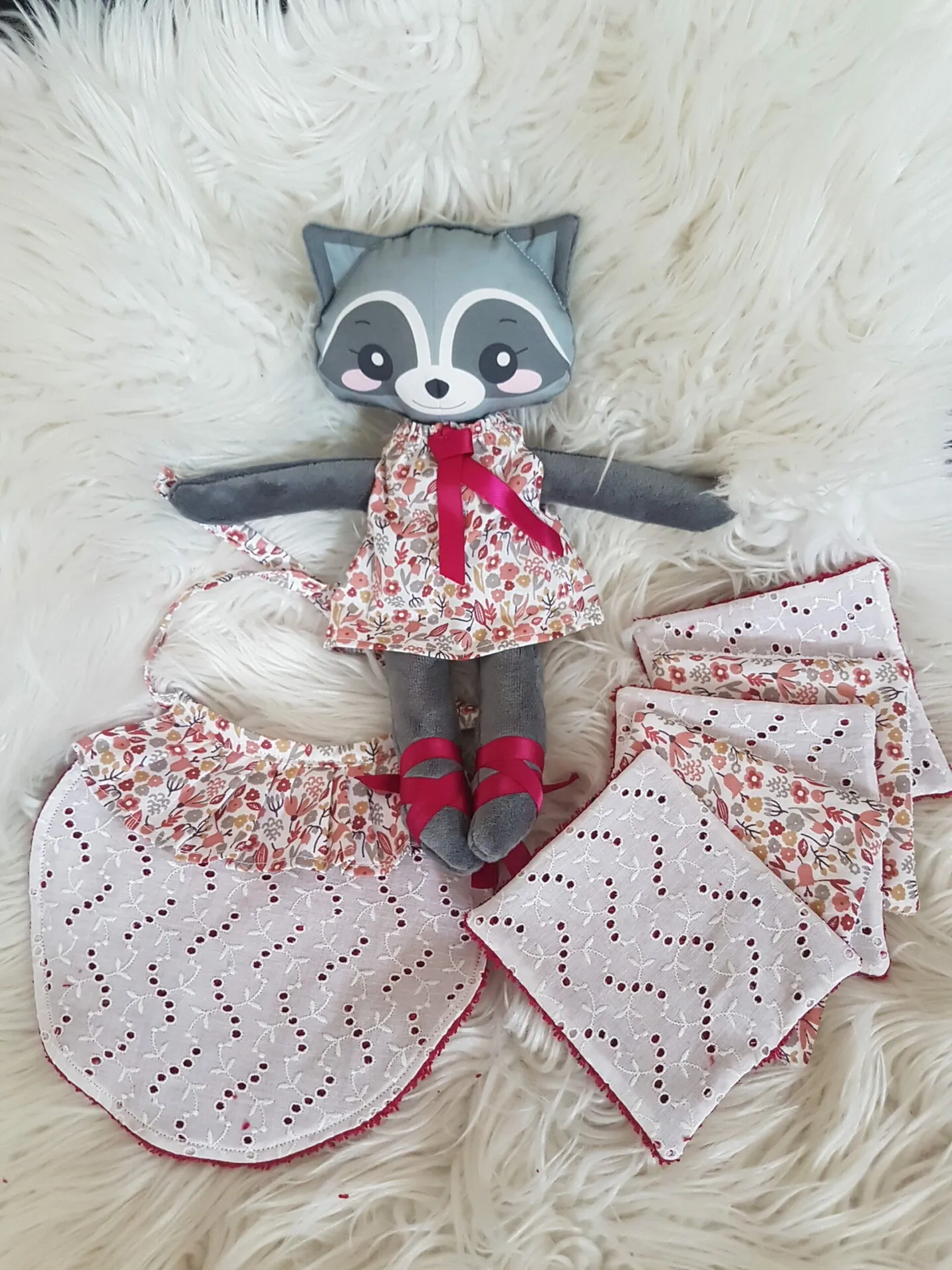 Joli coffret naissance comprenant : une poupée raton-laveur coton, polyester, intérieur polyester un bavoir naissance éponge de coton / coton 5 lingettes lavables éponge de coton / coton
