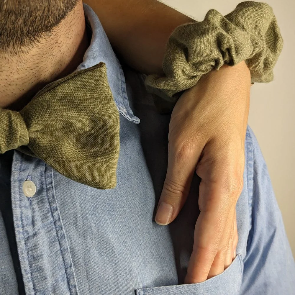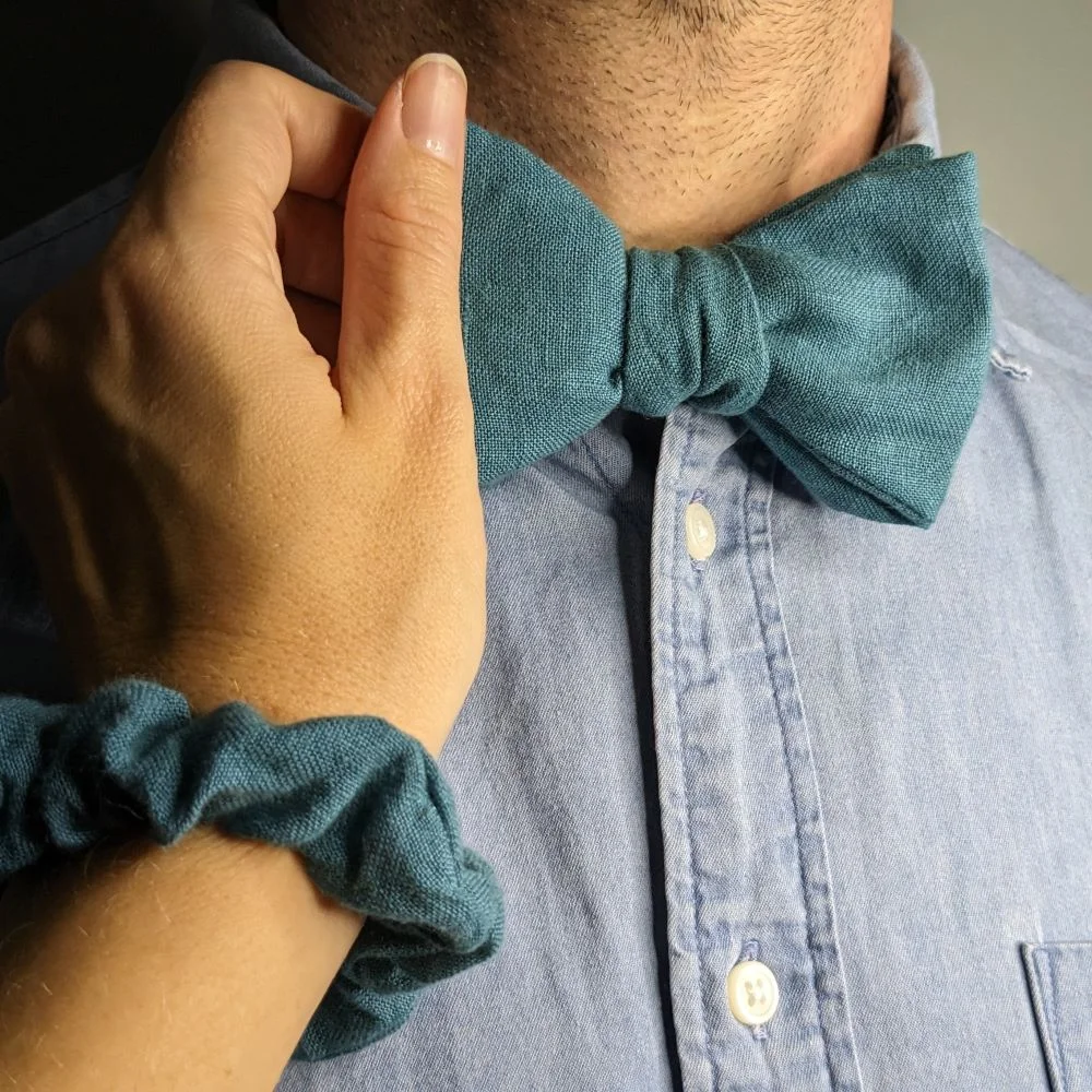 Magnifique coffret contenant un nœud papillon en lin et un chouchou assortis ! Choisissez la couleur de tissu qui vous convient parmi les nombreux coloris de lins tissés en France de mon stock. Faites (vous) plaisir à coup sûr !