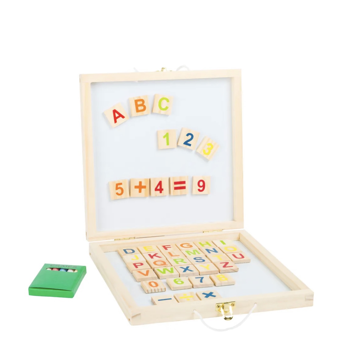 Écrire ou compter? Avec ce coffret, c’est toi qui décides. Les lettres et chiffres aimantés invitent à des exercices mathématiques et à l’orthographe. Personnalise ton coffret en dessinant les ardoises du couvercle ou en y écrivant ton prénom! Boîte de rangement pratique!