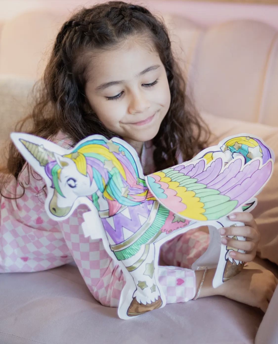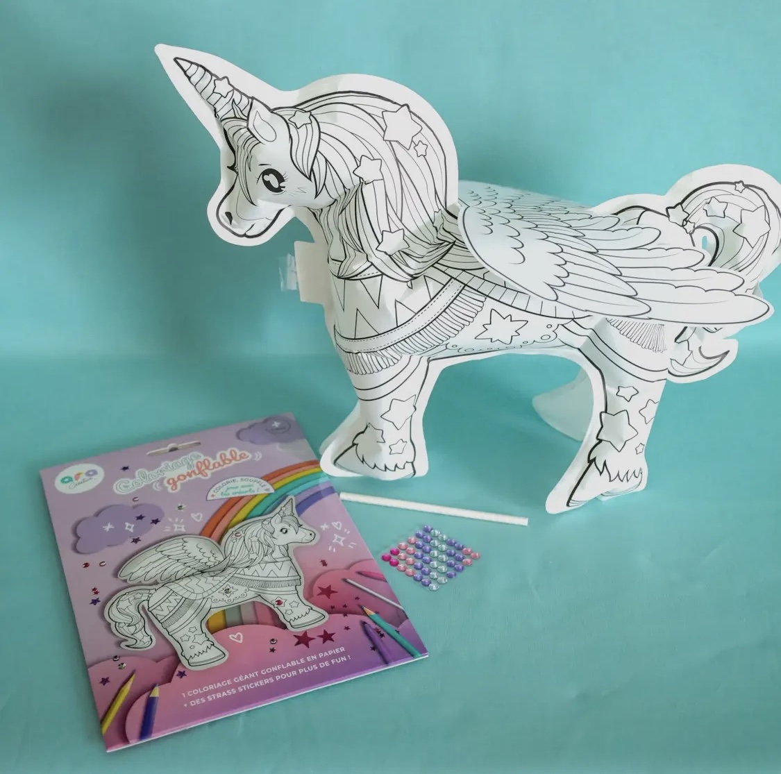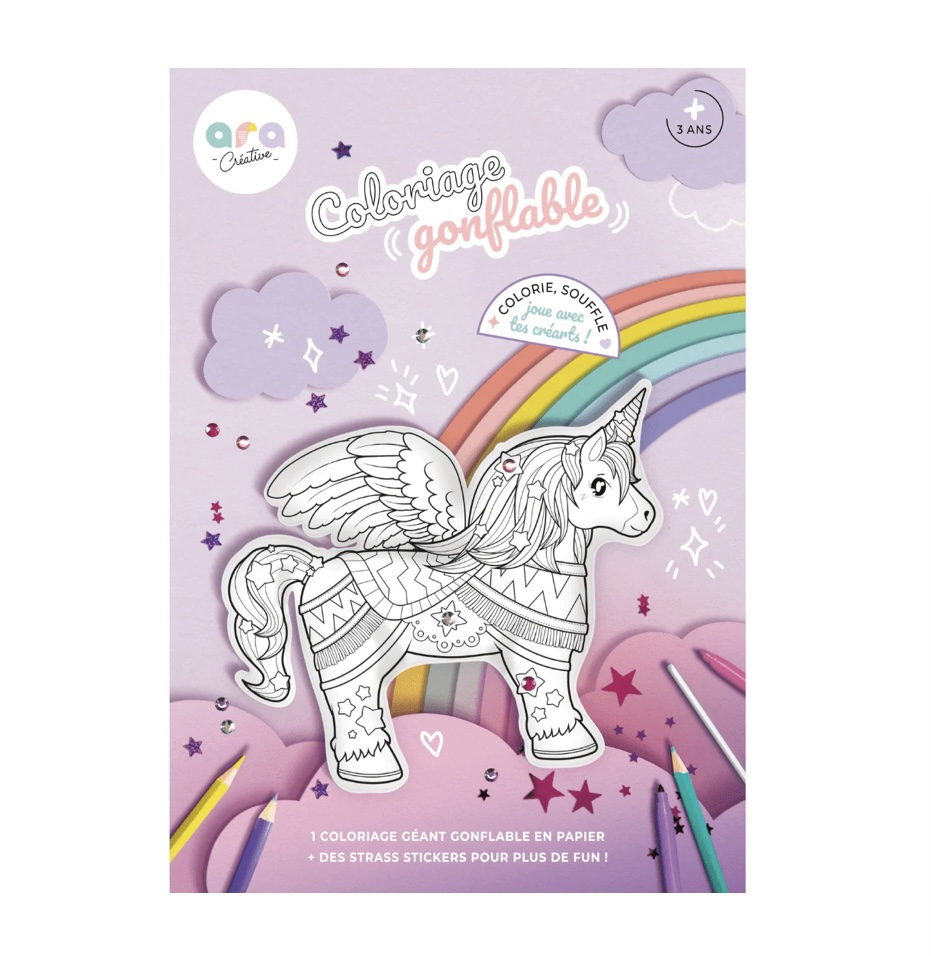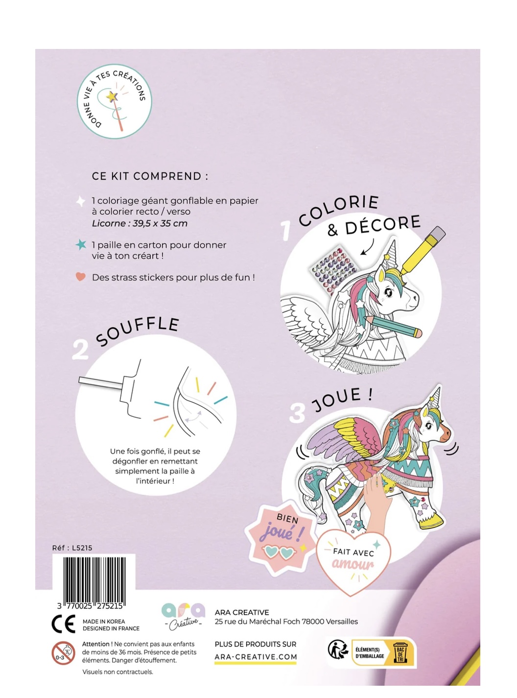 La Licorne géante et ses ailes à colorier feront sensation en jouet ou en jolie décoration. Mode d’emploi : c’est SUPER facile ! 1. Colorie avec des crayons, feutres, pastels, peintures car OUI, le Créart est en papier ! 2. Décore la licorne avec les strass stickers qui se trouvent à l’intérieur de la pochette 3. Souffle avec la paille pour donner vie à ton Créart 4. Joue avec la Licorne magique ou expose la dans ta chambre *Contenu : 1 licorne géante gonflable + 1 paille en papier + des strass stickers pour plus de fun !