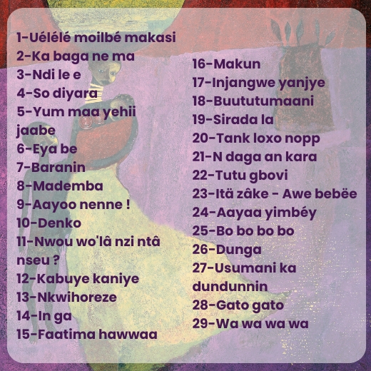 Une sélection de comptines et berceuses les plus représentatives de l’Afrique noire, de la Côte-d’Ivoire au Rwanda, dans la diversité des langues.