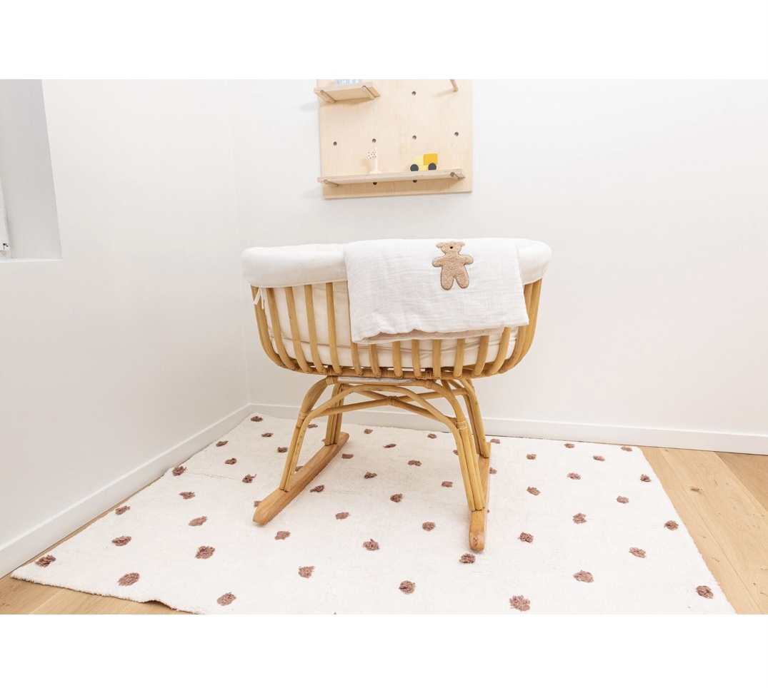 Couverture ultra douce pour bébé avec une adorable silhouette d’ourson. Elle peut être utilisée des deux côtés et comporte un côté écru et un côté beige. Avec ses dimensions généreuses, elle vous sera utile dans la chambre de bébé pour le tenir au chaud, mais aussi en balade, dans la poussette, dans le siège auto ou pour faire jouer bébé au sol en déplacement. Son jersey de coton doux la rend particulièrement agréable et douce pour la peau fragile de bébé.