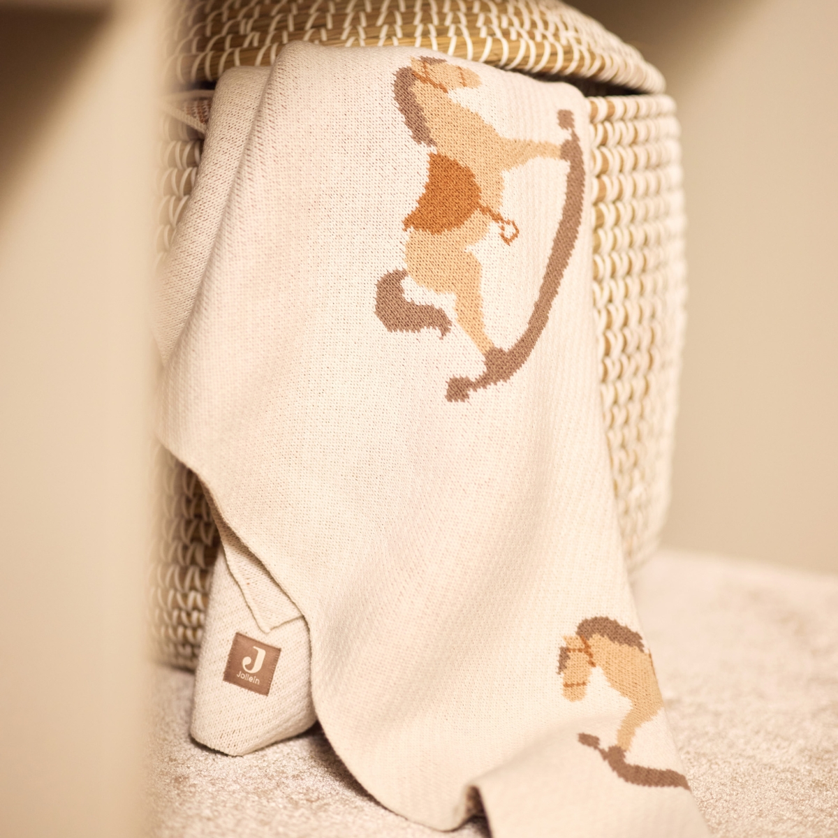 Nous sommes totalement sous le charme de cette adorable couverture de la collection Nostalgic Ride. Décorée de chevaux à bascule et fabriquée dans un tissu tricoté très doux, cette couverture conviendra parfaitement à n’importe quelle chambre d’enfant.
