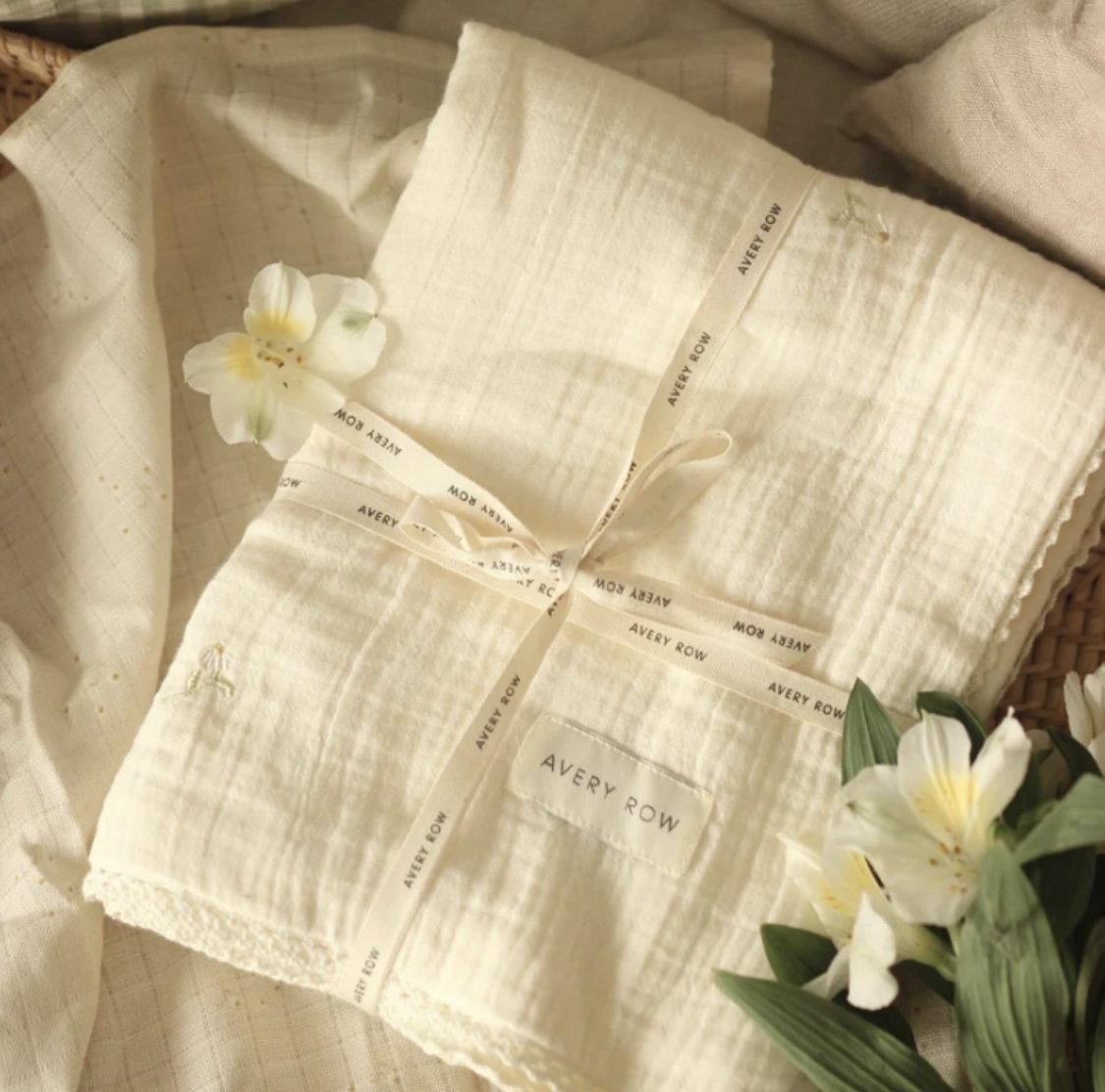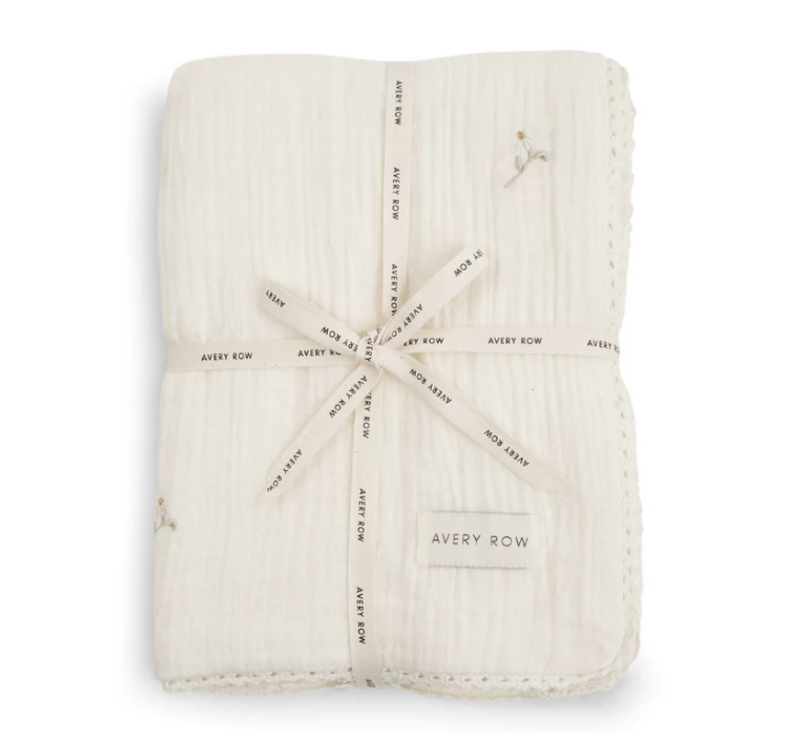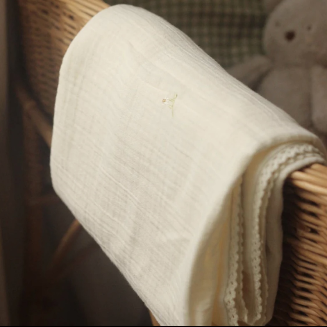Cette jolie couverture en mousseline 4 couches est brodée de jolies fleurs. Finie avec une bordure en dentelle délicate, cette couverture légère et respirante est parfaite pour votre petit bout et fait un joli cadeau.