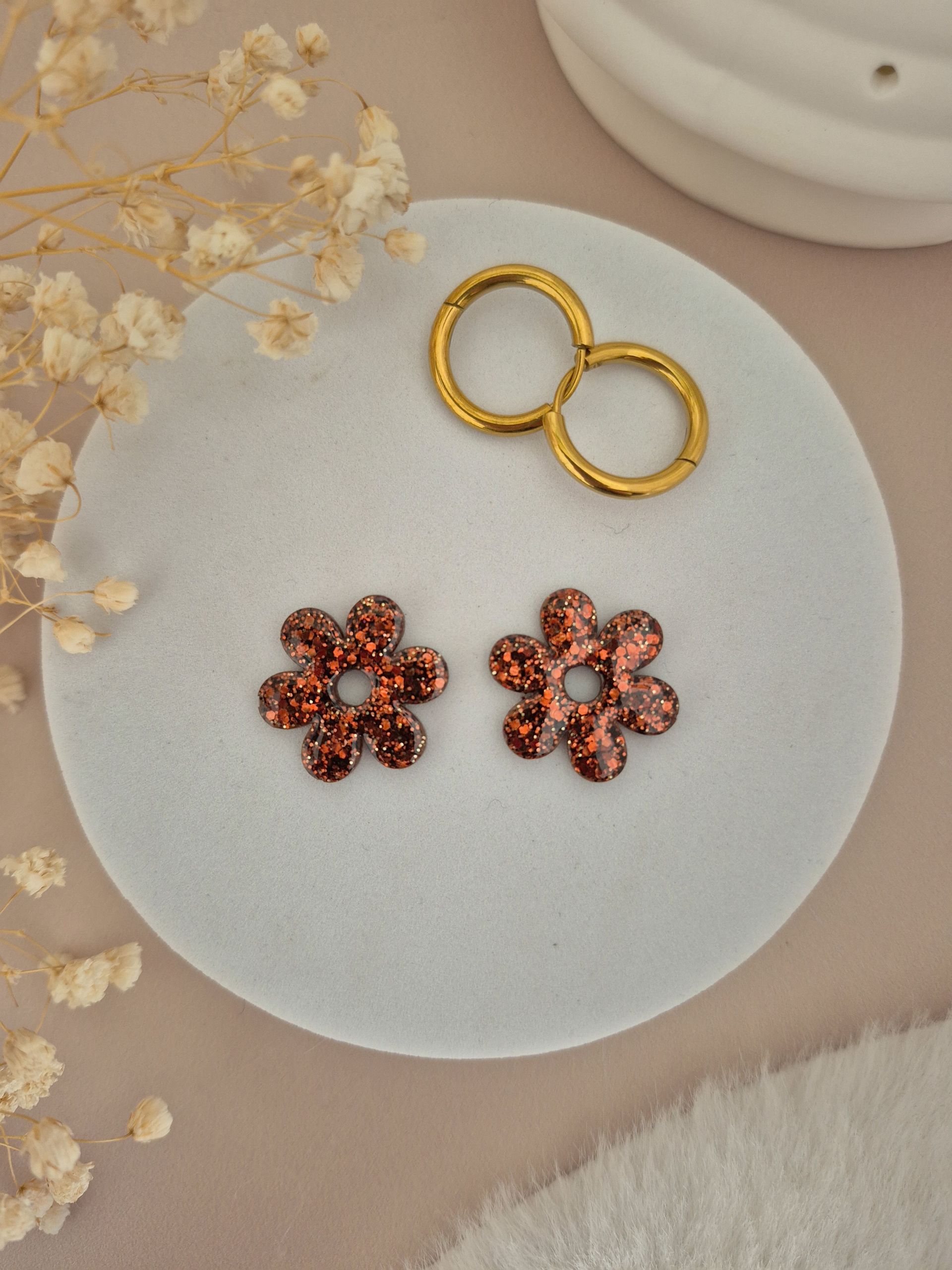 La fleur est faite main, en résine epoxy de marque française, avec inclusion de paillettes.