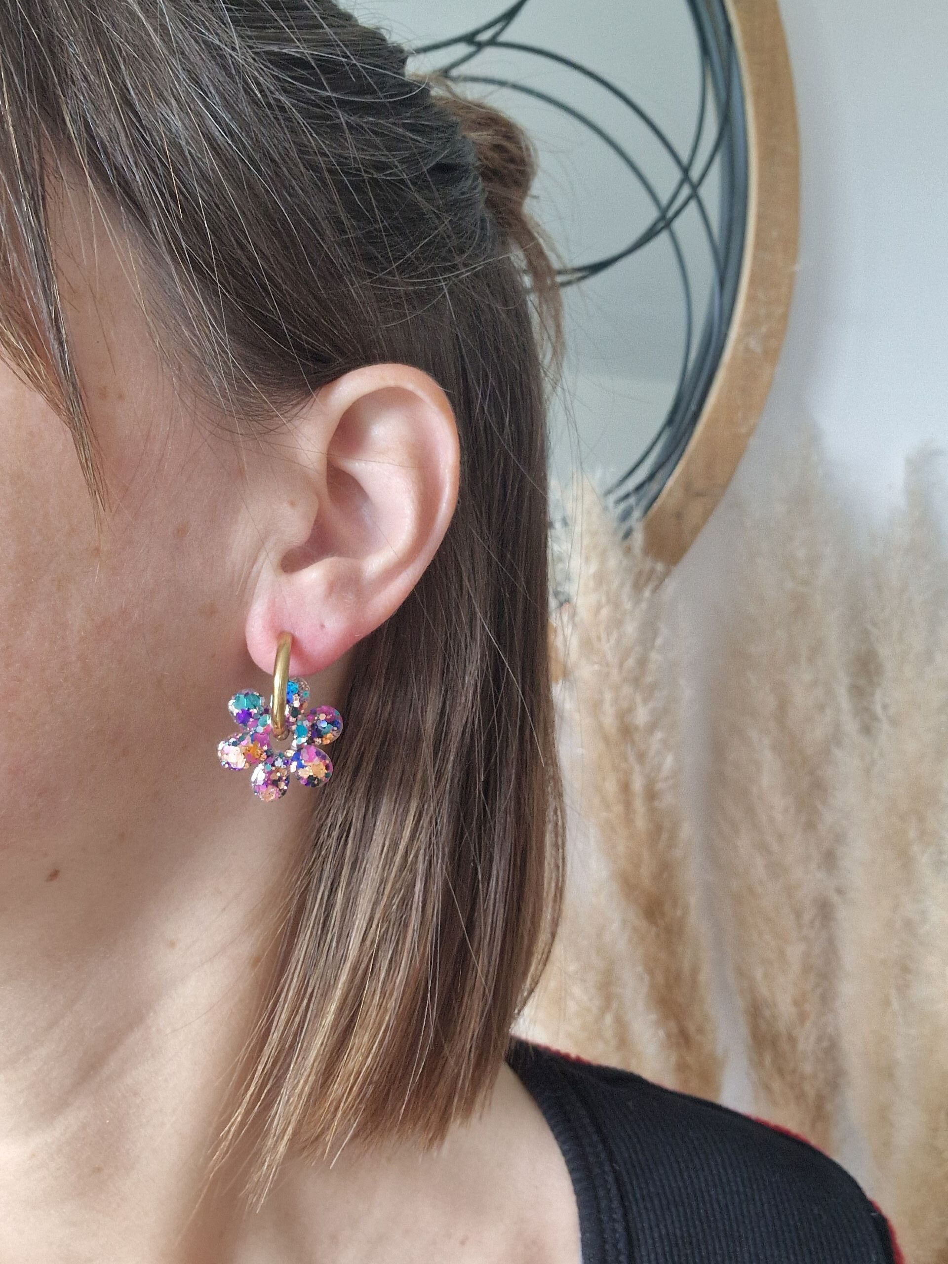 La fleur est faite main, en résine epoxy de marque française, avec inclusion de paillettes.