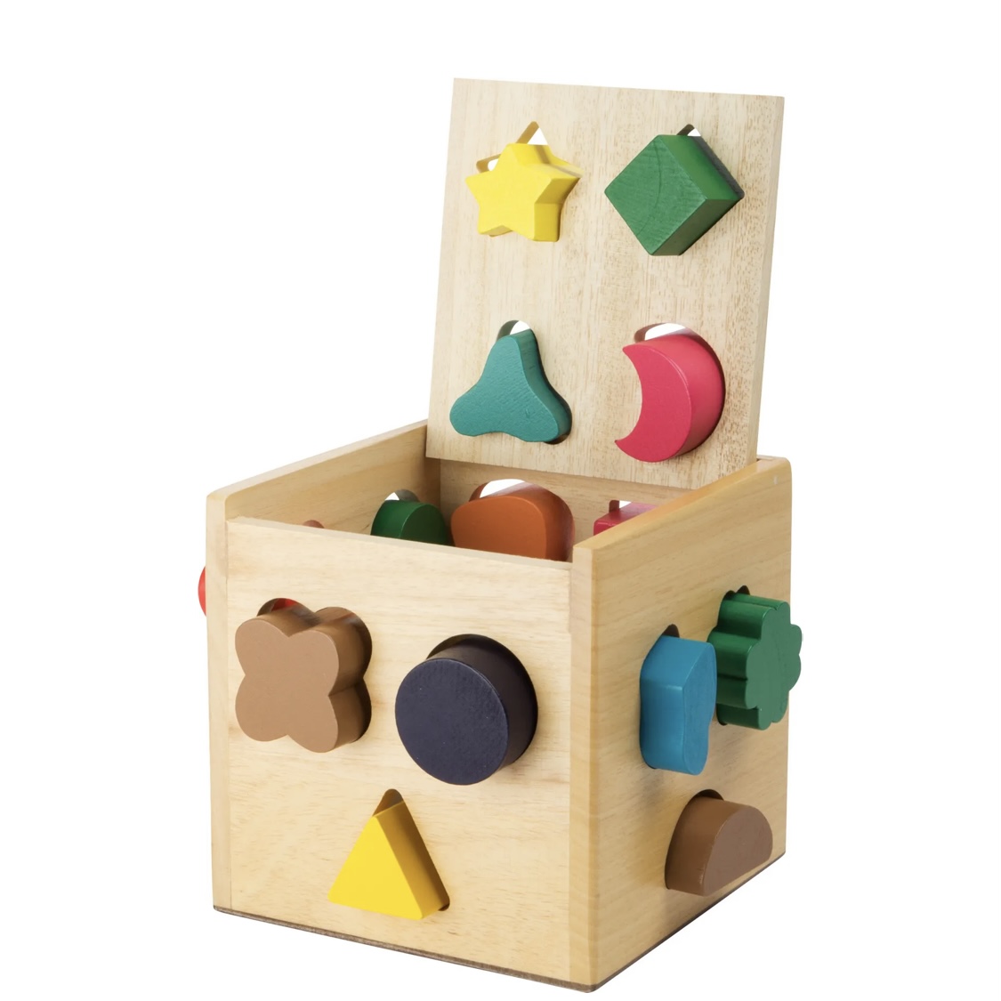 Apprenez les couleurs et les formes de façon ludique ! Ce solide cube en bois présente des découpes sur cinq côtés, à travers lesquelles un seul bloc de bois peut passer à la fois. Un jeu de forme classique pour l’entraînement de la motricité fine et la reconnaissance des formes. Pour retirer à nouveau les blocs de construction, il suffit de rabattre le couvercle du cube vers le haut.
