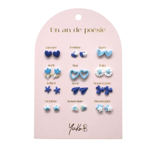 Ensemble de 12 paires de boucles d’oreilles en céramique – Un An de Poésie bleue.