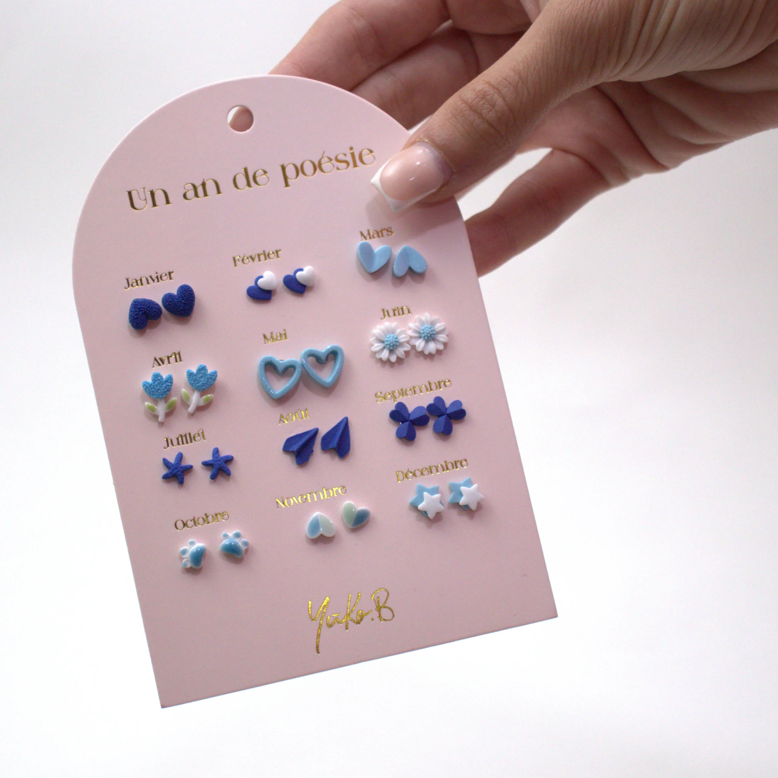 Un an de Poésie… La collection de boucles d’oreilles thématique créée pour offrir ou tout simplement s’offrir. 12 paires de boucles d’oreilles en céramique et tige en acier inoxydable dont une paire par mois de l’année.