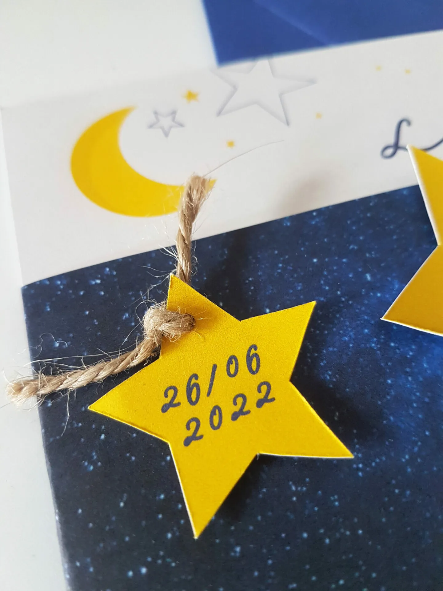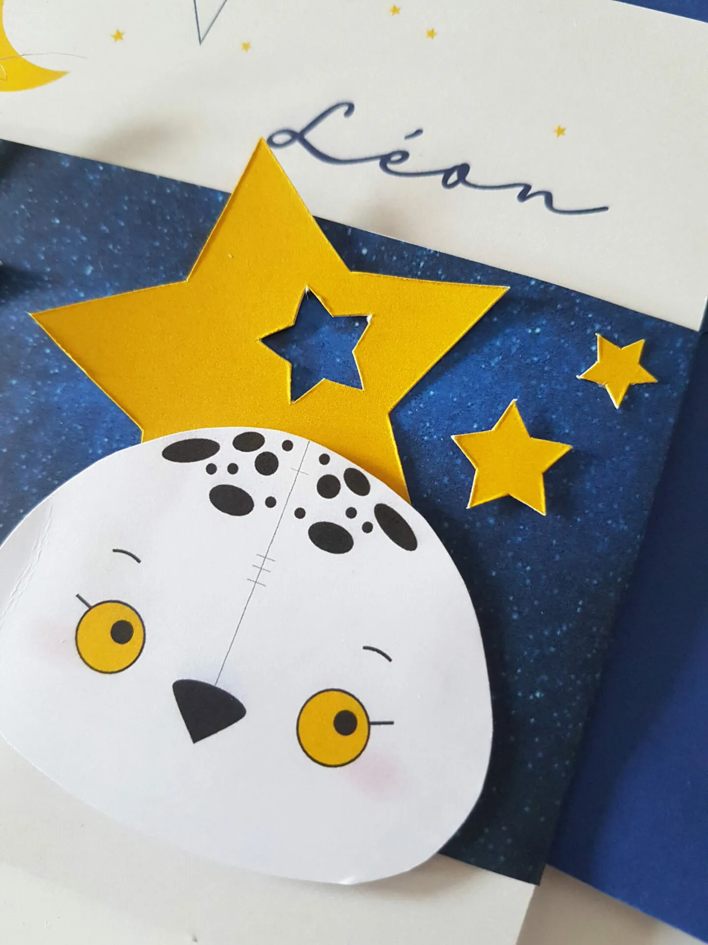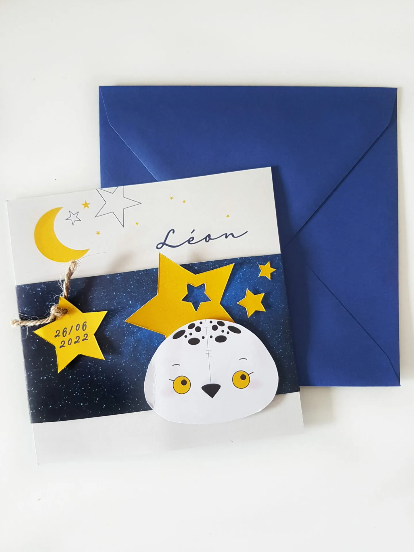 Les étoiles et la chouette blanche sont en relief. Ce faire-part est composé d’un bandeau bleu nuit a motif étoilé servant de « pochette » décorative, et d’un carton carré contenant toutes les informations servant de faire-part. La carton est surmonté d’une pastille « date » en relief accompagné de son lien.