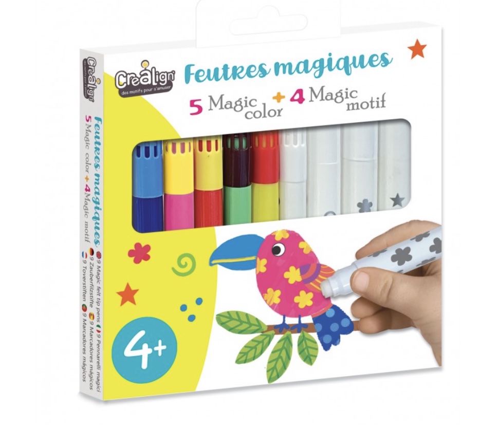 5 feutres de couleurs et 4 feutres « magiques motifs » pour dessiner tout en s’amusant !