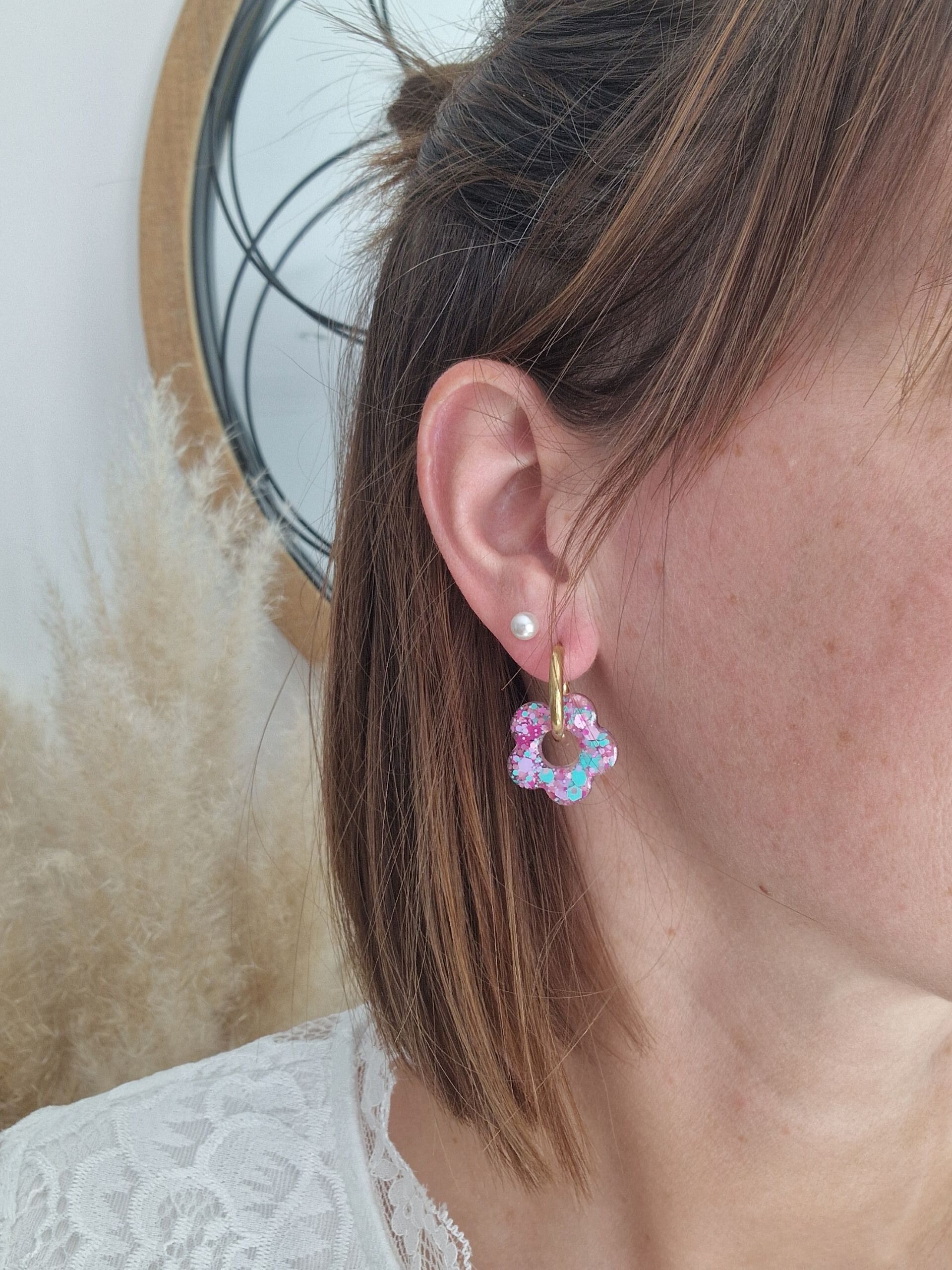 La fleur est faite main, en résine de marque française, avec inclusion de paillettes.