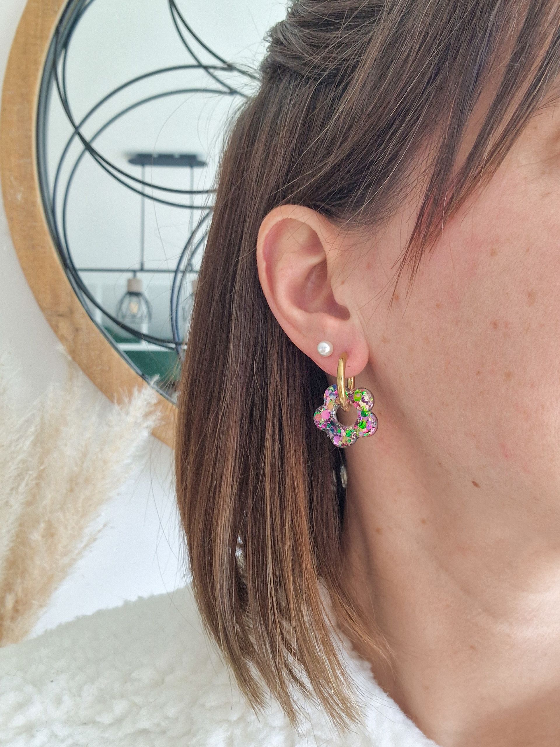 La fleur est faite main, en résine de marque française, avec inclusion de paillettes.
