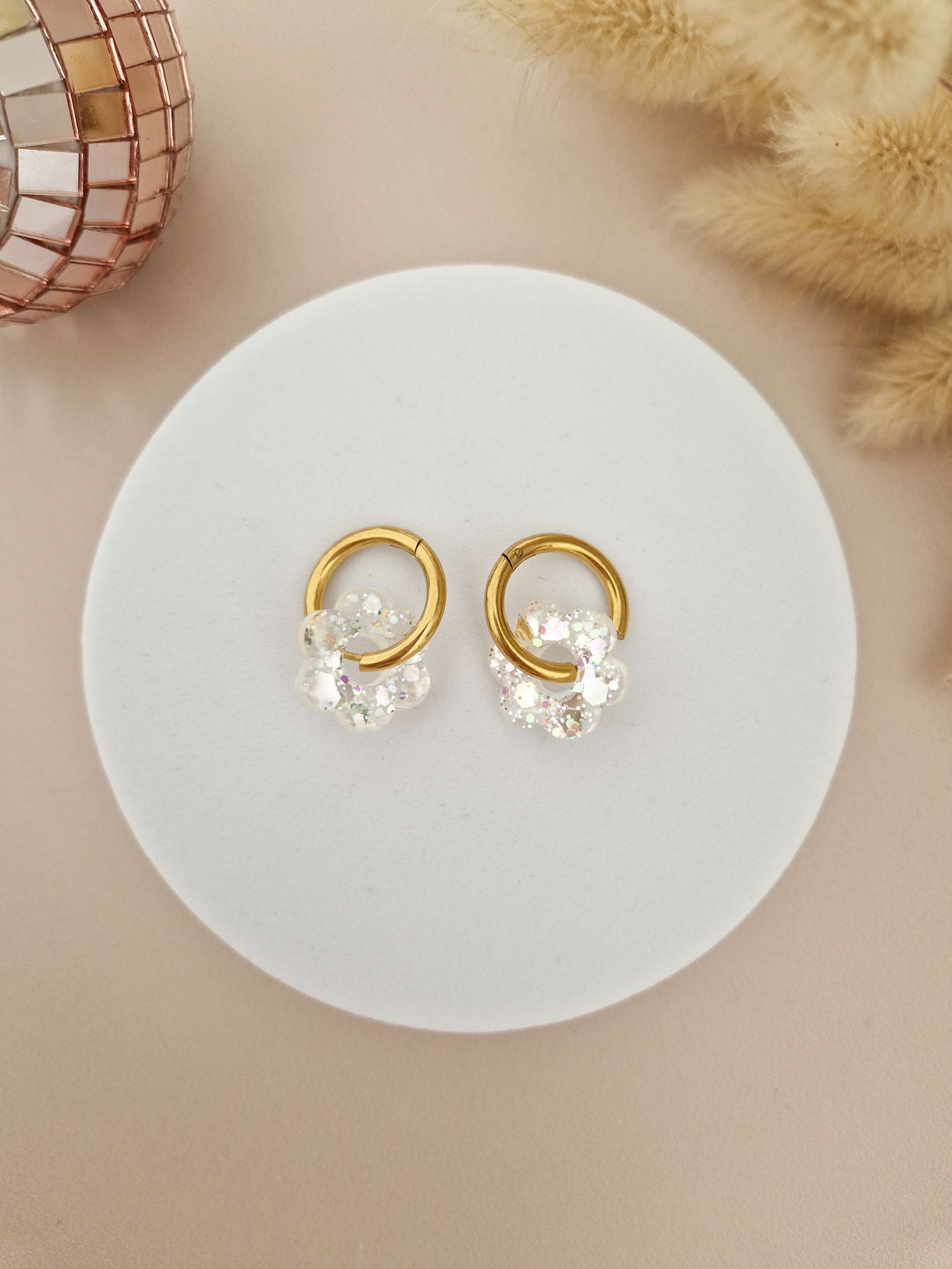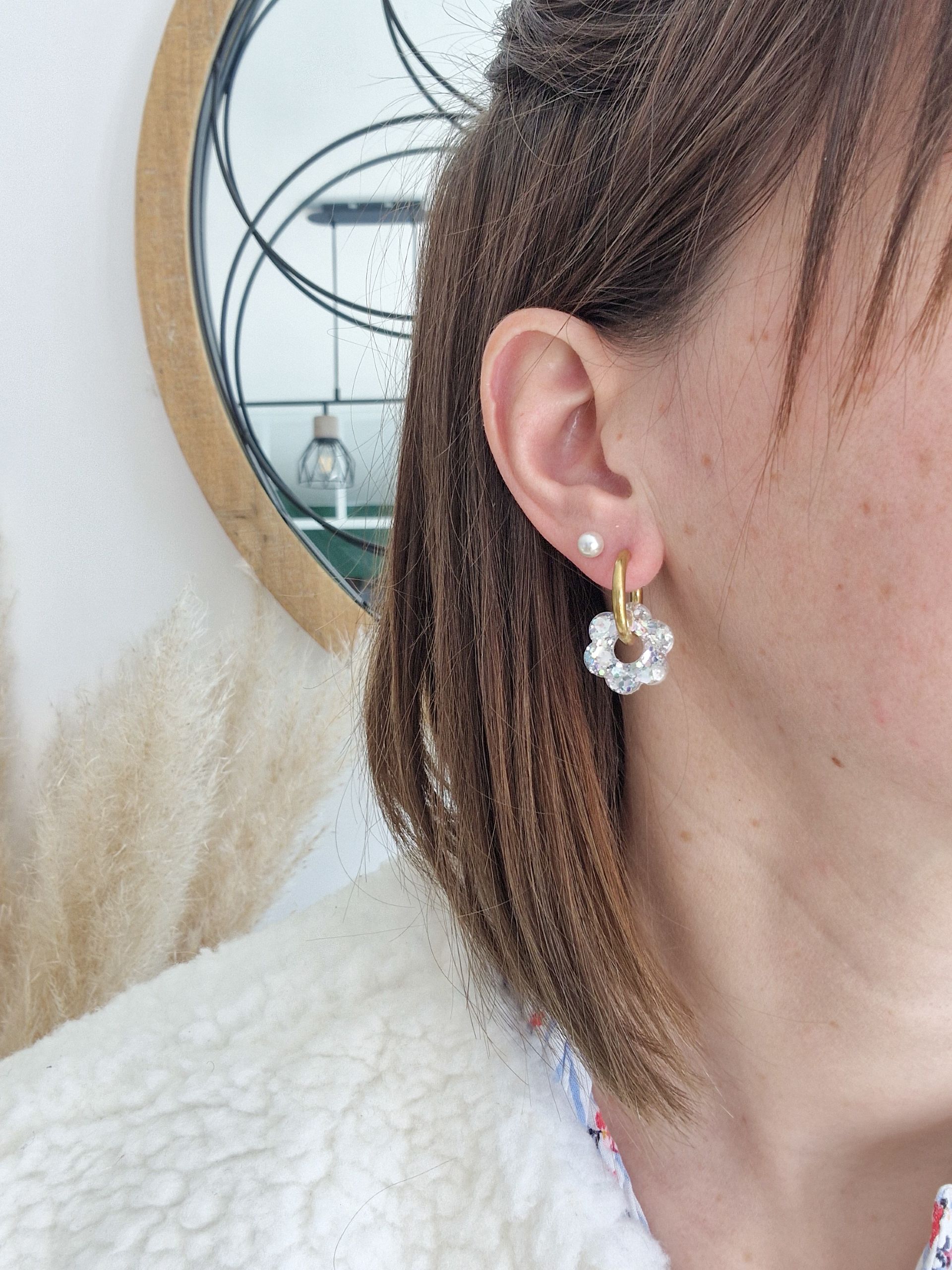 La fleur est faite main, en résine de marque française, avec inclusion de paillettes.