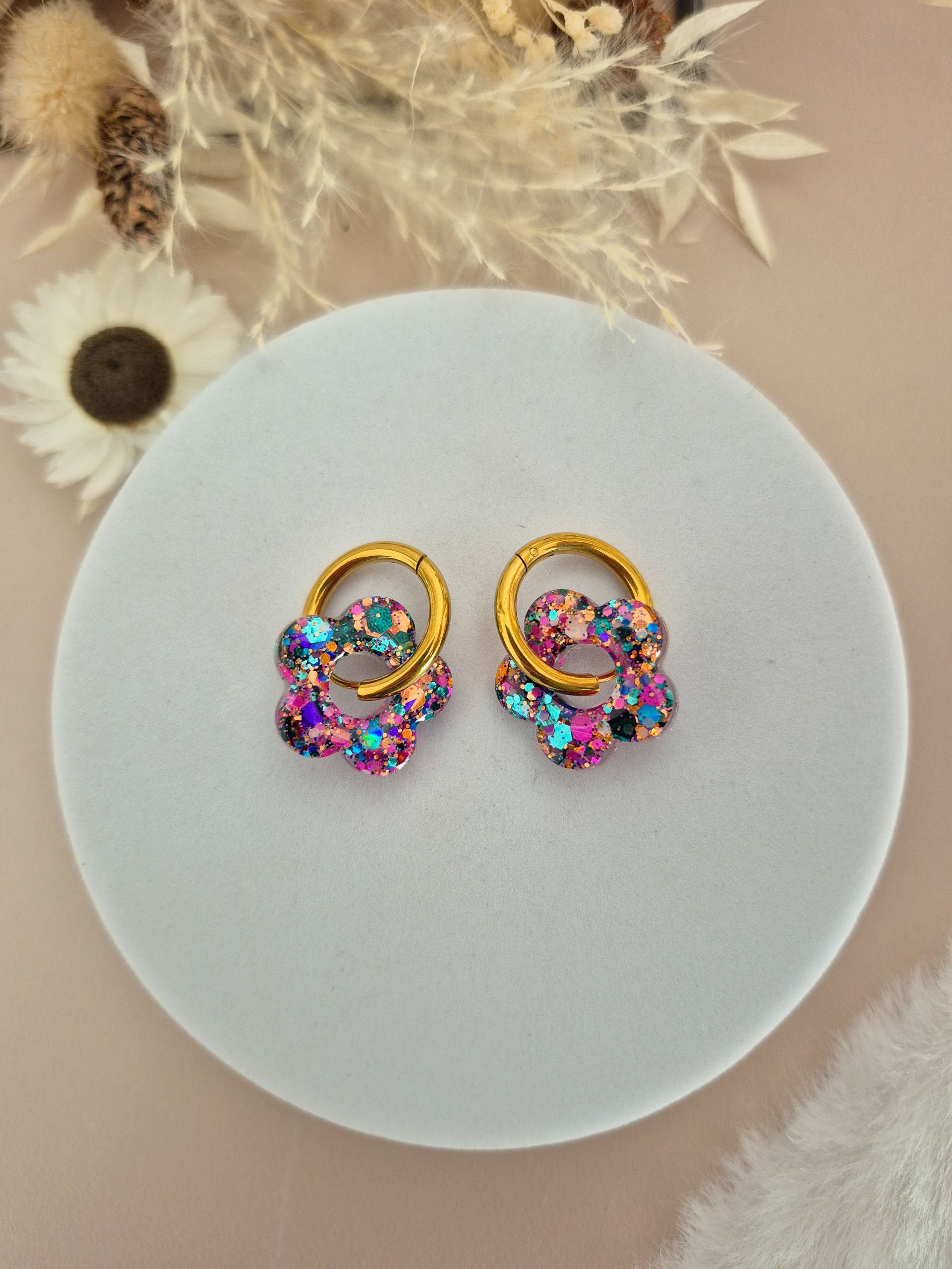 La fleur est faite main, en résine de marque française, avec inclusion de paillettes.