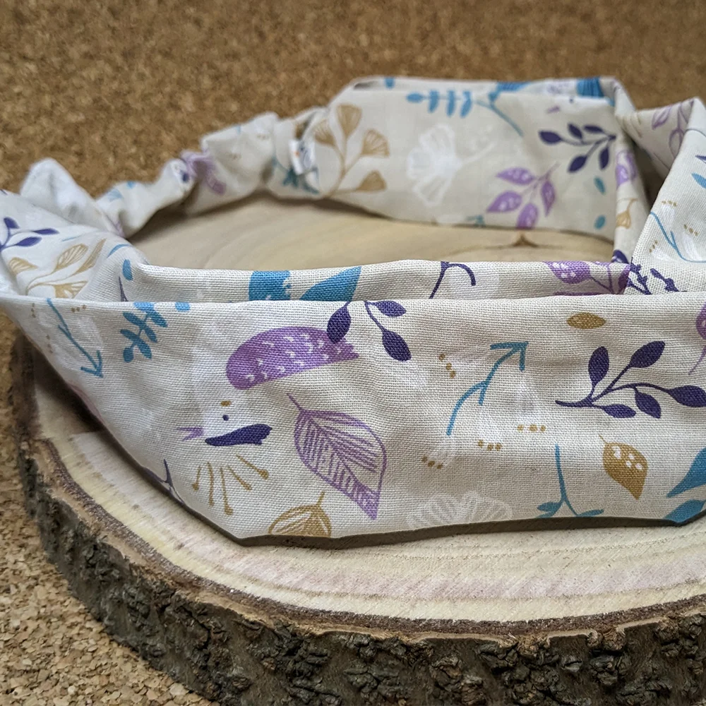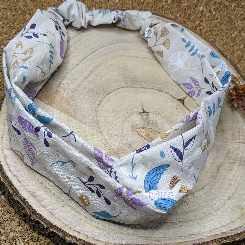 Composé d’oiseaux, de fleurs et de feuillages, ce headband en coton imprimé sur fond gris aspire au printemps et aux secrets du passé. Doux et tendres pastels se combinent pour coordonner parfaitement ce bandeau avec toutes vos tenues ! L’enchevêtrement des motifs raconte une jolie poésie, délicate et sensuelle. Ce headband violet tendance et mode, saura séduire et faire plaisir.