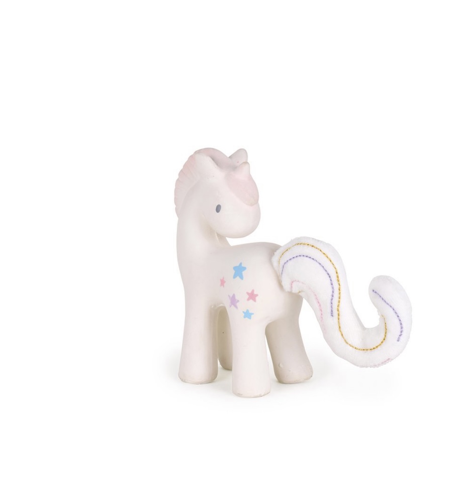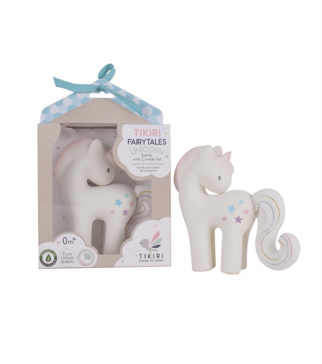 Ce hochet licorne en caoutchouc naturel pour le corps et tissus avec papier bruissant au niveau de la queue, pour stimuler le développement sensoriel de bébé.