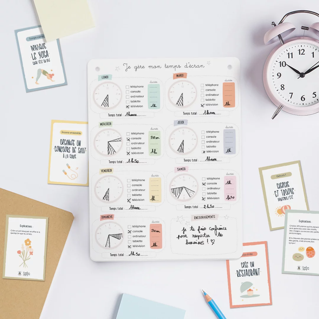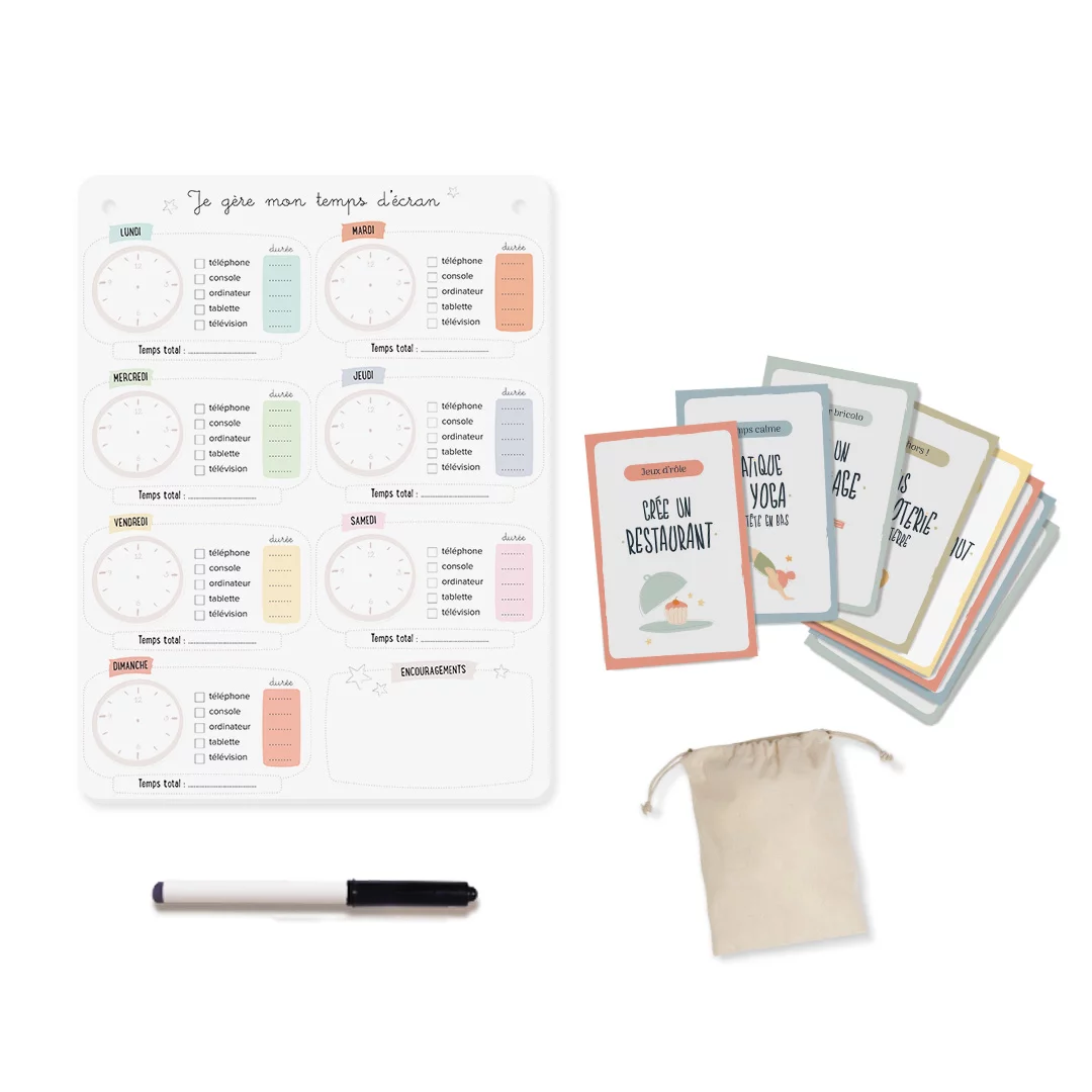 Profitez d’un kit ludique pour apprendre à votre enfant à gérer son temps d’écran et lui proposer des activités lorsque ce temps d’écran est terminé.